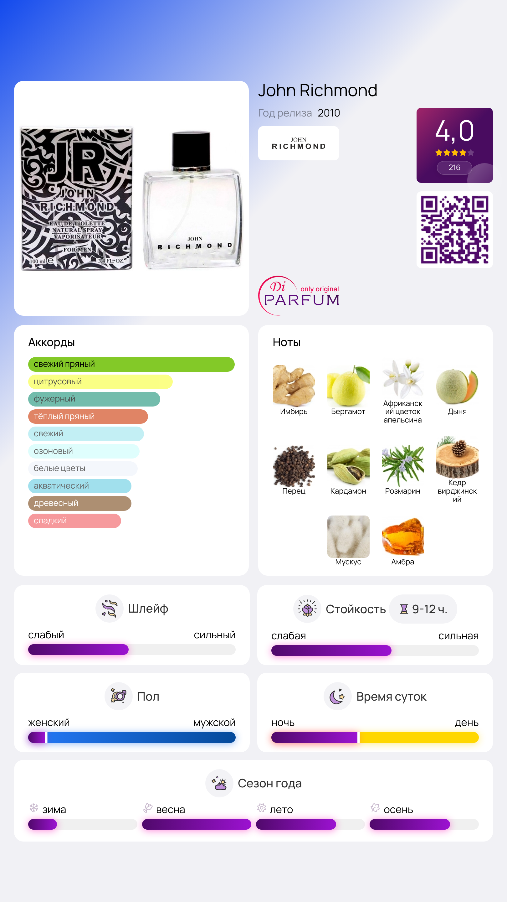 Аромат John Richmond объединяет пряные восточные ноты, обволакивая мужчину атмосферой тепла. Это выдающееся сочетание моды, роскоши и трендов, воплощенное филигранной работой парфюмеров. Здесь улавливается элегантность и аристократизм вплоть до мельчайших деталей.