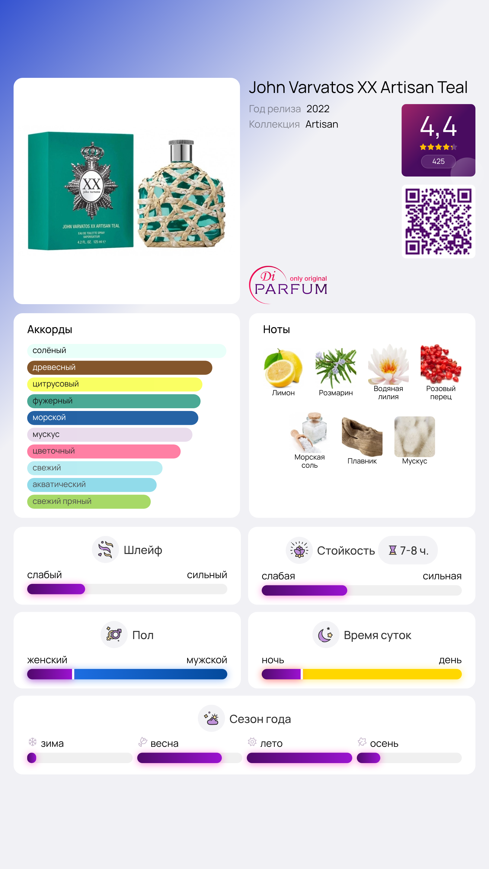 XX Artisan Teal от John Varvatos - это ароматический водный парфюм для мужчин, выпущенный в 2022 году. Верхние ноты включают в себя лимон и розмарин, в сердце аромата звучат водяная лилия и розовый перец, а базовые ноты составляют морская соль, древесина и мускус.