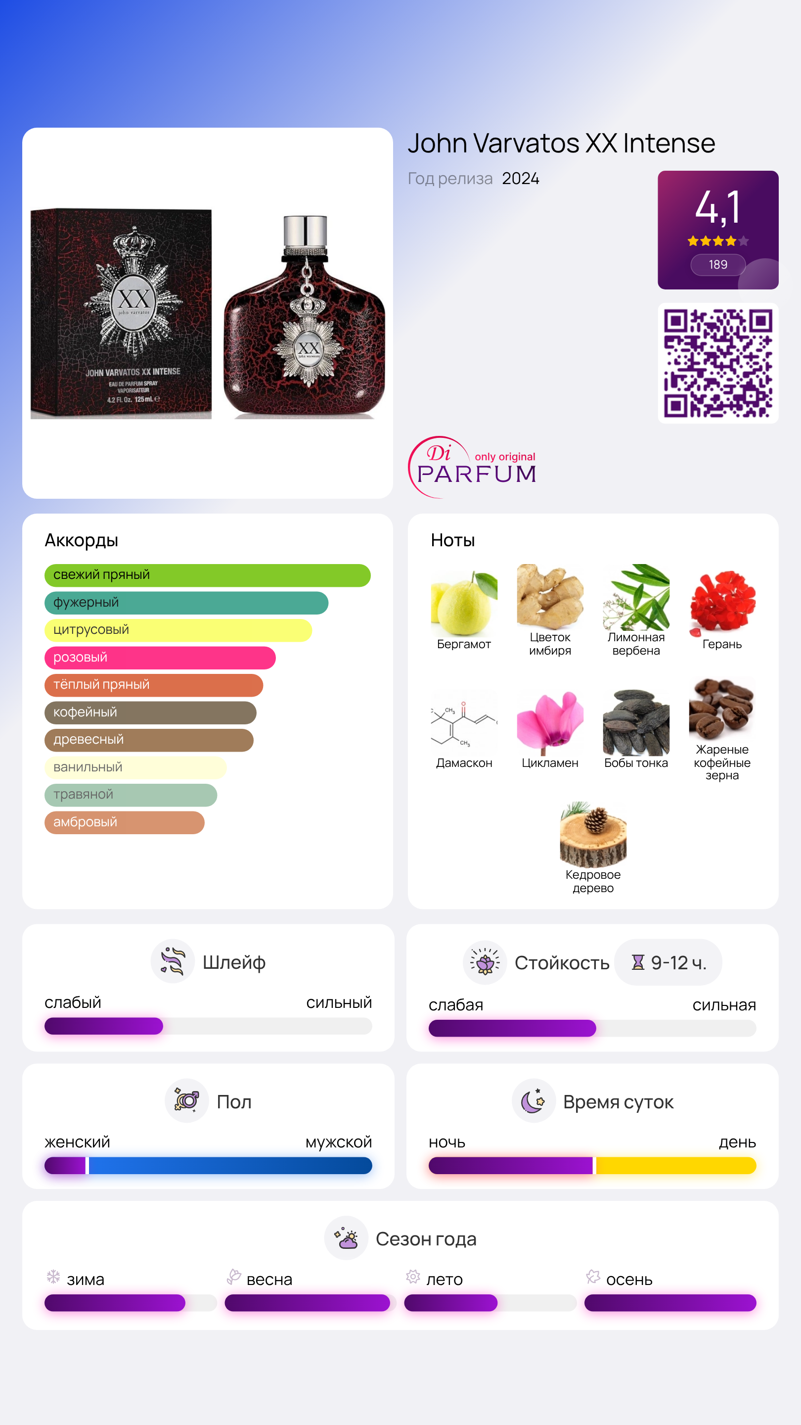 John Varvatos XX Intense от John Varvatos — это восточно-древесный аромат для мужчин, который был запущен в 2024 году. Этот парфюм сочетает в себе яркие и глубокие ноты, создавая уникальную и запоминающуюся композицию.