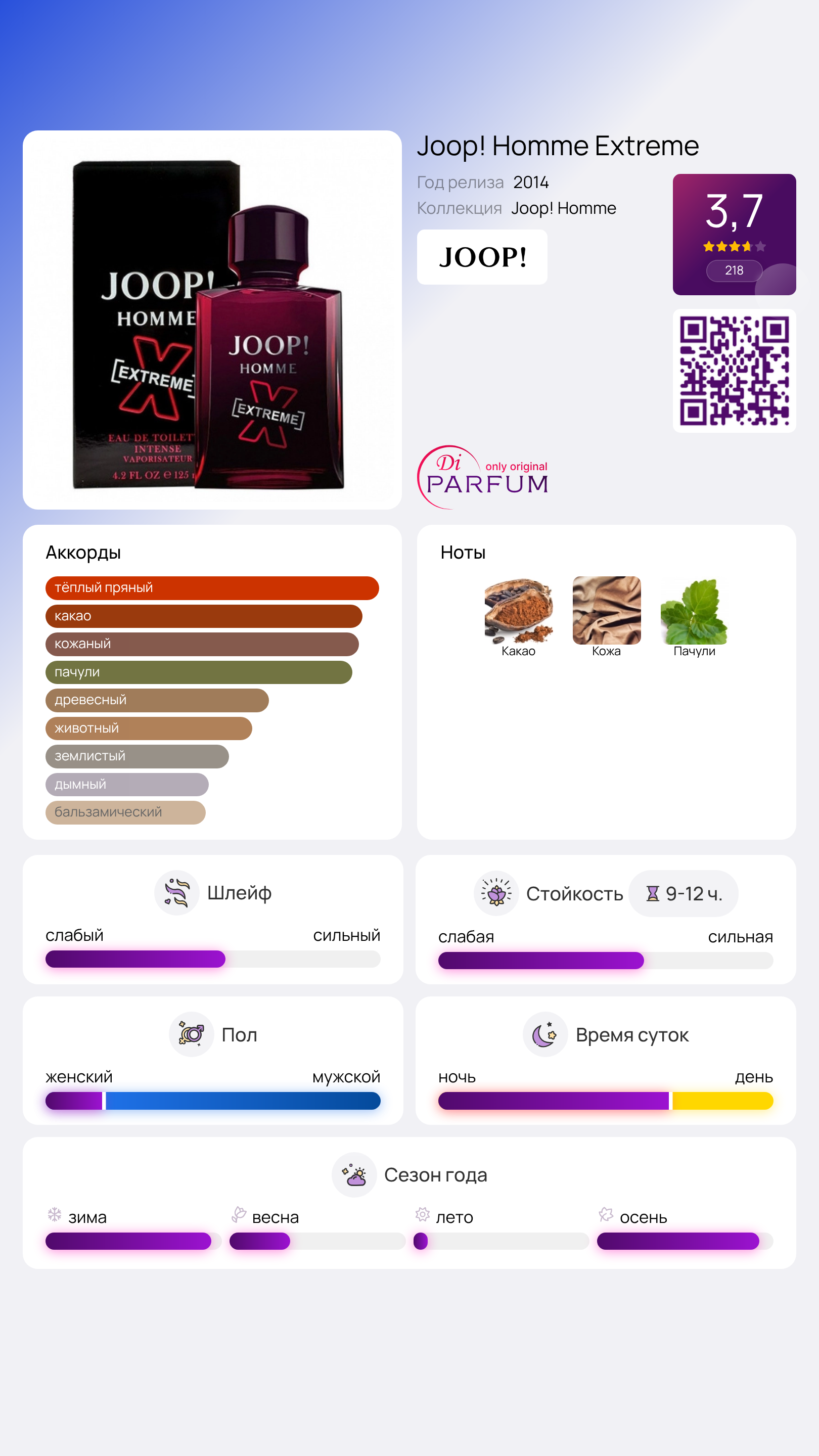 Слоган рекламной кампании фланкера легендарного Joop! Homme 1989 года - аромата Joop! Homme Extreme — "Real Men Get More", что переводится как "Настоящие мужчины получают больше". Они стремятся к достижению максимальных результатов во всем, будь то карьера, личная жизнь или спорт. Горячий, дерзкий и чувственный аромат этого парфюма символизирует силу и стремление, он принадлежит к восточной пряной группе. Его первая нота — мощный запах какао, затем сердце заполняет аромат кожи, а завершает всю композицию пачули. Неудивительно, что представительницы прекрасного пола могут поколебаться от такого соблазнительного и манящего звучания!