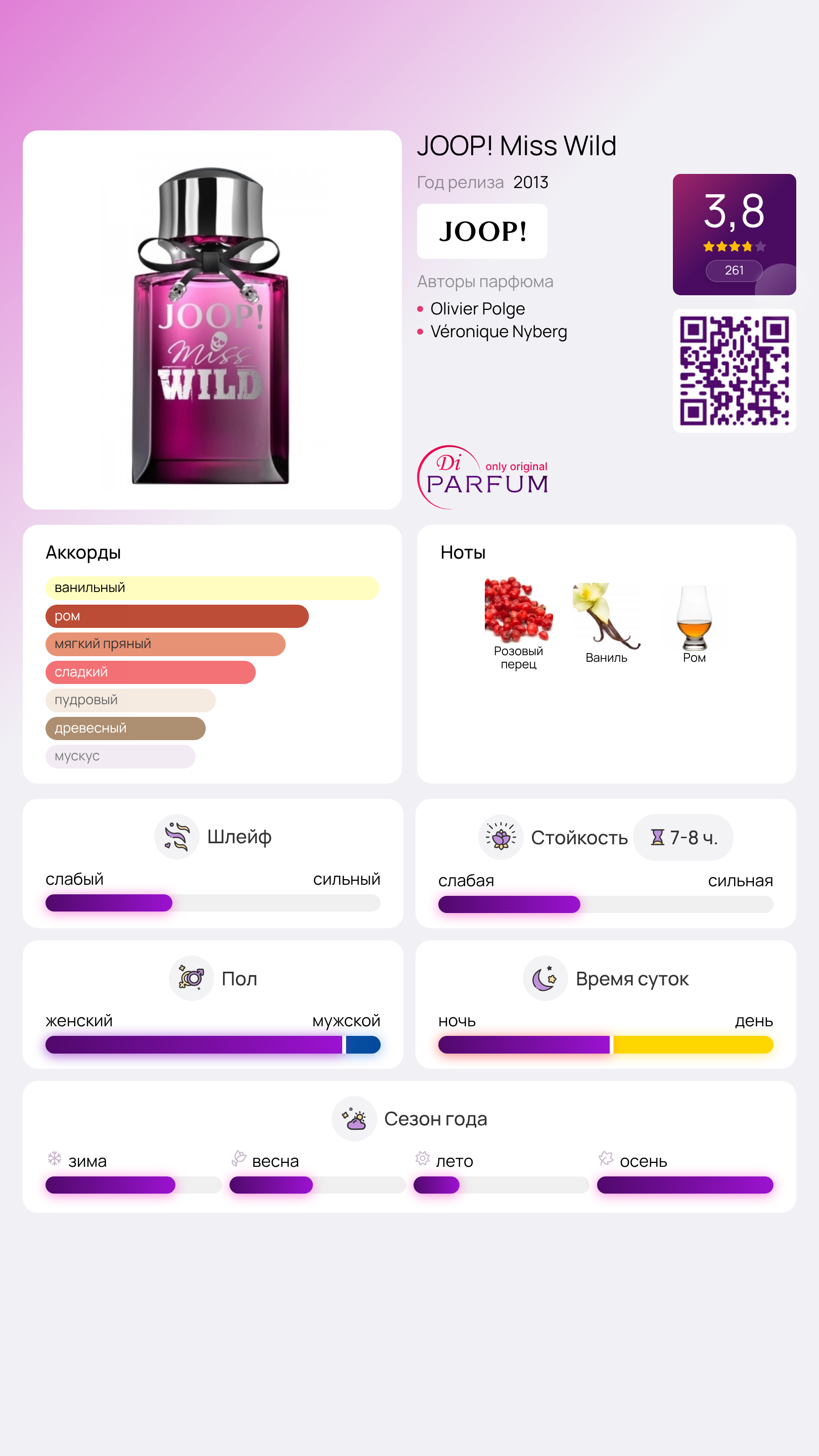 Парфюмерная вода Miss Wild от Joop! из Германии - это источник страсти и энергии, замкнутый в драгоценном флаконе. Этот восточный аромат 2013 года предсказуемо опасен, точно так же, как и женщина, выбравшая его. Его композиция захватывает с первых аккордов благодаря перчинке, завораживает сердце сладкой ванилью и пьянит базовым шлейфом рома. Три слова, что наилучшим образом описывают этот аромат - опасность, соблазн и вызов!