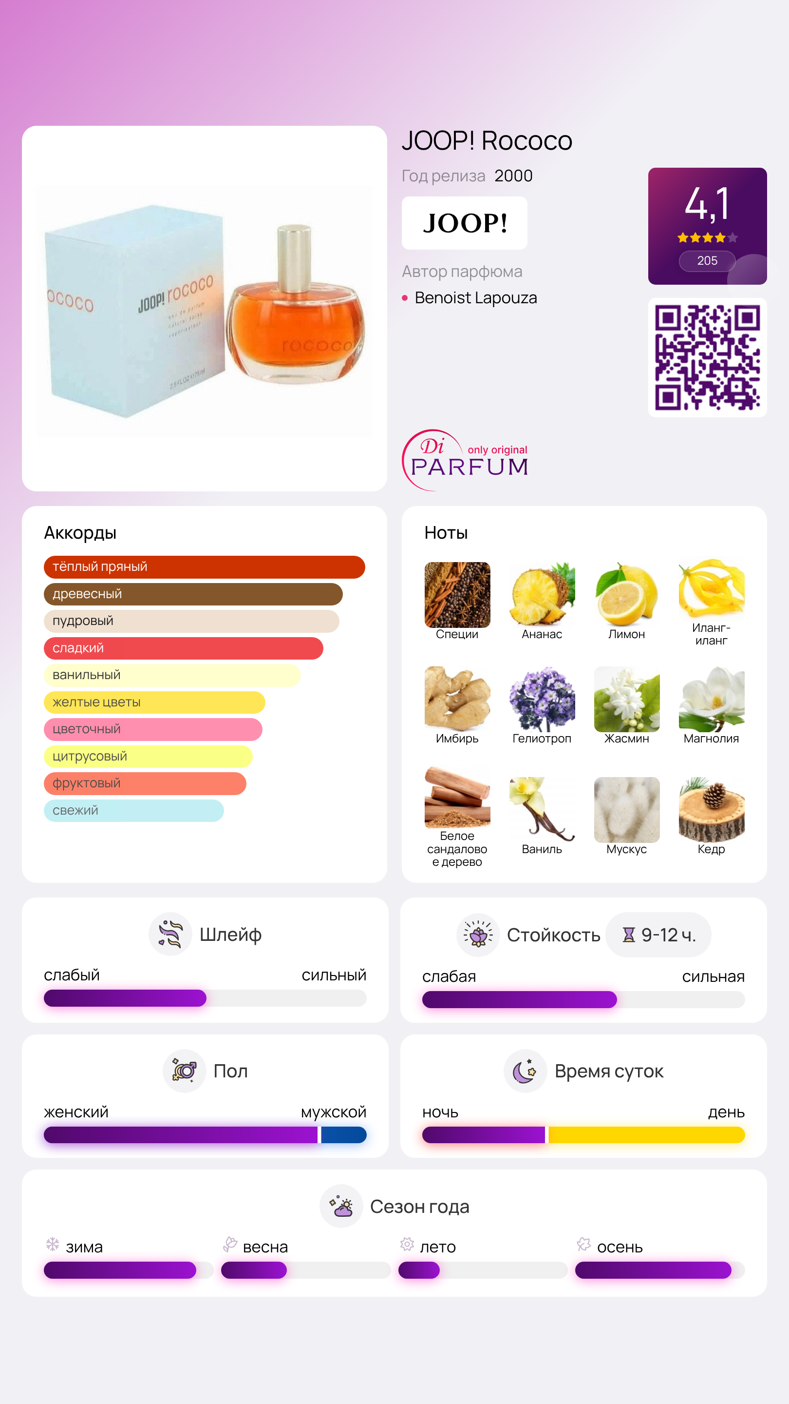 Духи Rococo от Joop с ароматом цветущих цветов были выпущены в 2000 году. В их композиции сочетаются ноты специй, ананаса и цитрусов. В сердце аромата запечатлено сочетание магнолии, имбиря, жасмина, гелиотропа, иланг-иланга и розы, создающее невероятно нежное звучание. Основу композиции составляют сандаловое дерево, мускус, ваниль и кедр.