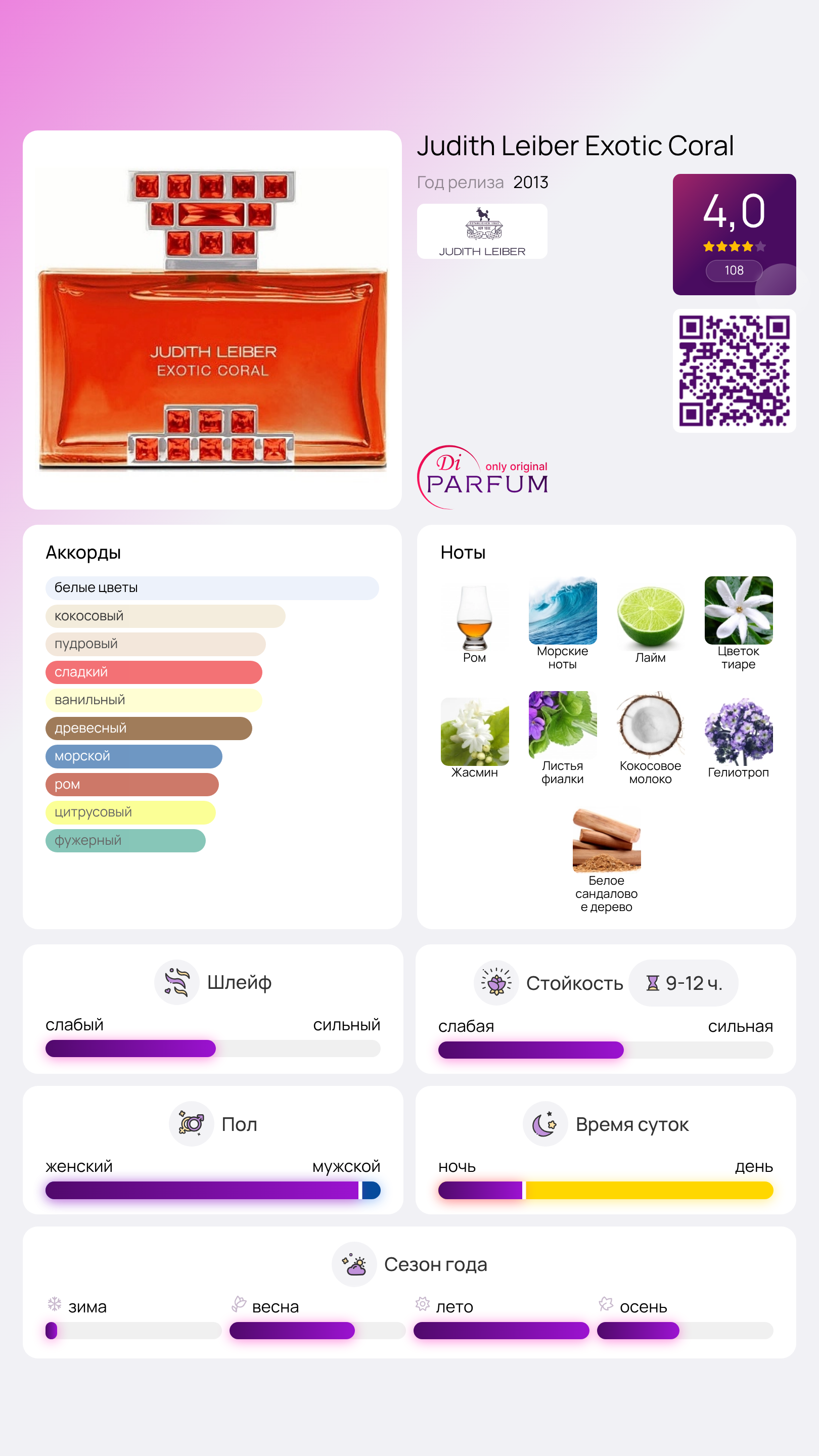 В 2013 году бренд Judith Leiber из США выпустил новый женский парфюм под названием Exotic Coral, который стал ярким дополнением к их коллекции насыщенных сладких ароматов. Начальные ноты аромата, включающие морские аккорды, лайм и ром, постепенно открывают цветочное сердце, в котором преобладают свежий жасмин, тиаре и фиалковый лист. Базовые ноты, состоящие из благородного сандалового дерева, сладкого кокосового молока и нежного гелиотропа, делают этот аромат особенно насыщенным и стойким.