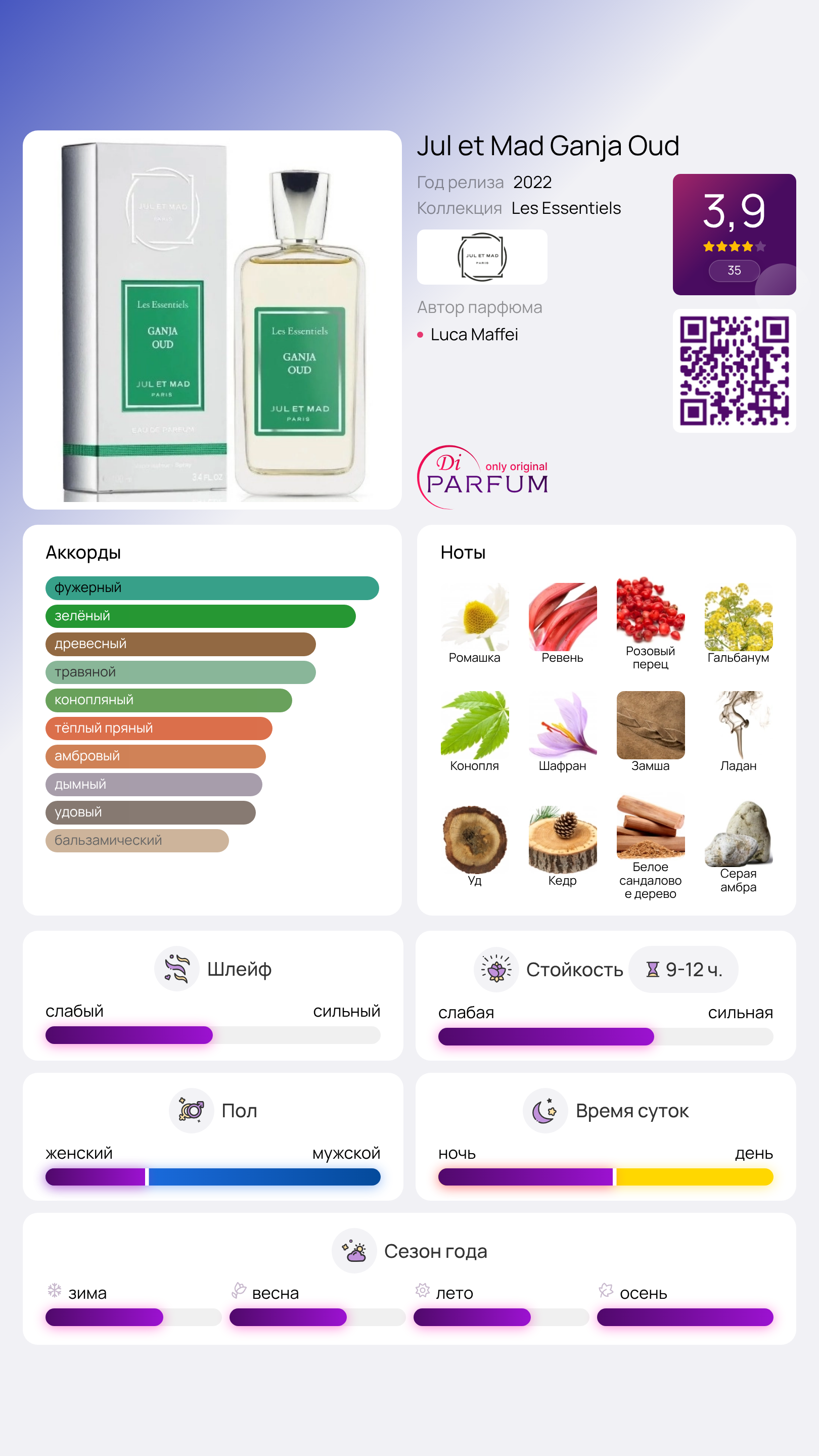 Элегантный фужерный аромат Jul et Mad Ganja Oud погружает в атмосферу природной гармонии и неповторимых ароматов Гянджинского Уда. Нежная цветочная нота ромашки смешивается с кислотой ревеня и свежестью гальбанума, дополненных острым перцем и ягодами. В сердце композиции мистическая конопля утонченно переплетается с ароматным шафраном и дымком замши. Изысканный шлейф, словно врата в мир магии, привлекает смесью ладана и загадочной амбры. Смолистое кедровое дерево и агаровая древесина смягчаются ванильным сандалом.