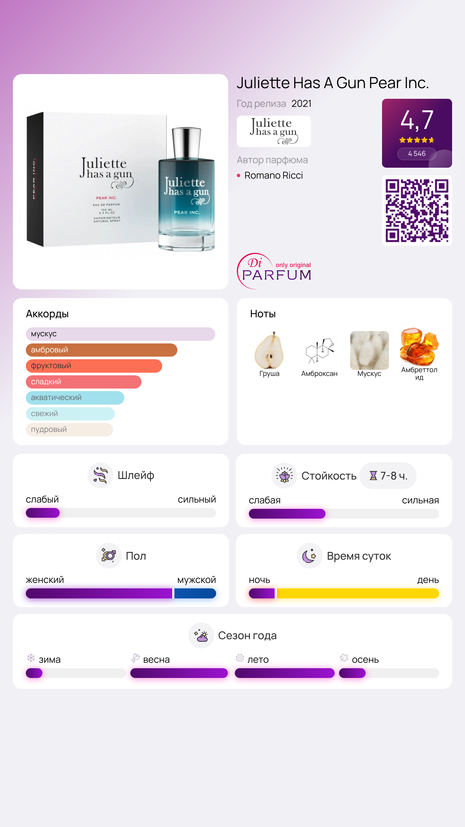 Великолепный ароматический напиток Pear Inc. представляет собой аромат лета на юге, наполненный запахом трав, спелых фруктов и теплых ночей под звездами. В каждой капле этого фруктового аромата, разработанного французским брендом Juliette Has A Gun в 2021 году, ощущается легкое прикосновение утреннего солнца, нежное дыхание морского бриза и свежесть утренней росы на зеленой траве.
