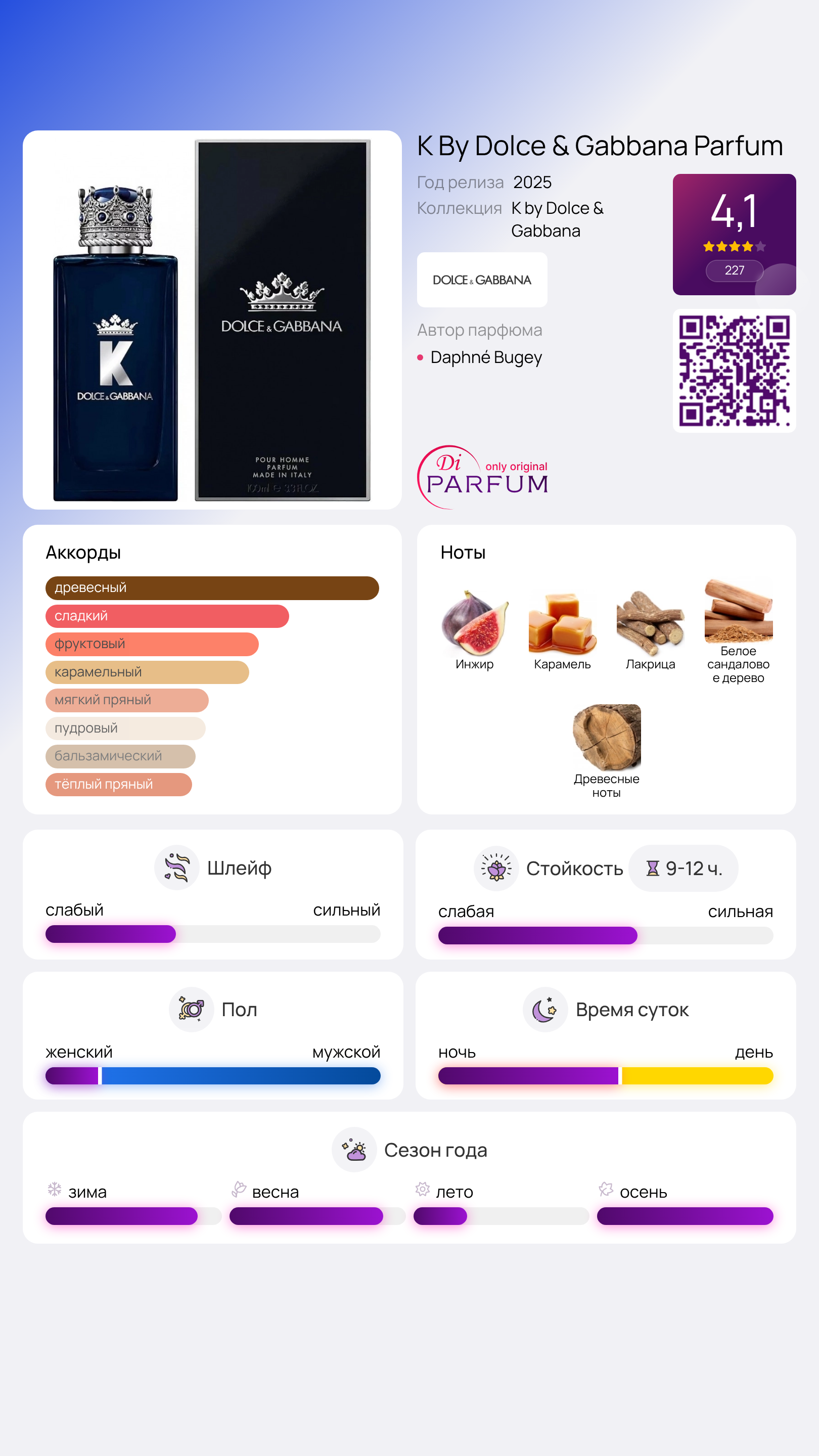 Мягкие древесные акценты сандала придают аромату глубину. Яркая композиция K By Dolce & Gabbana Parfum была выпущена знаменитым итальянским брендом в 2025 году как часть мужской линии из двух ароматов. В этот раз фланкеры поражают «беспрецедентной насыщенностью и яркой индивидуальностью». Элегантный флакон с логотипом бренда теперь имеет кобальтовый оттенок.