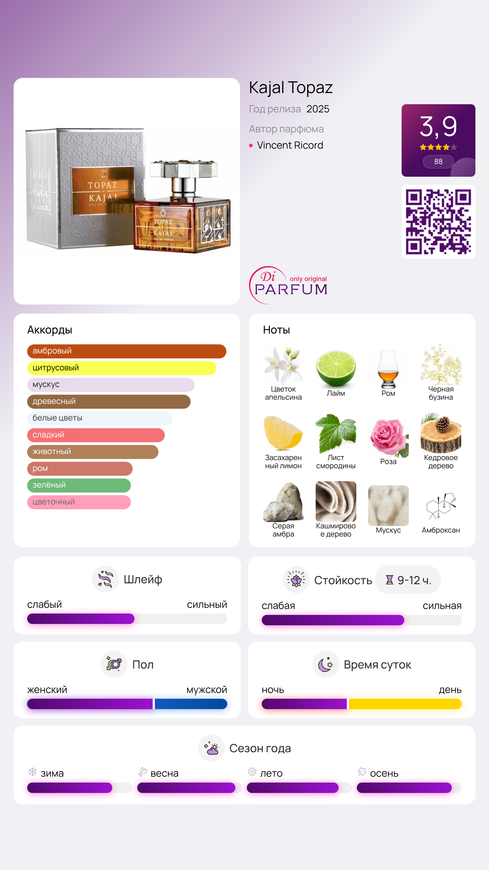 Topaz от Kajal — это восточно-цветочный аромат для женщин и мужчин, который был представлен в 2025 году. За создание этого уникального парфюма отвечает талантливый парфюмер Vincent Ricord. В верхних нотах вы ощутите необычайное сочетание лайма, цветка апельсина, рома и черной бузины, которые создают свежий и экзотический старт.