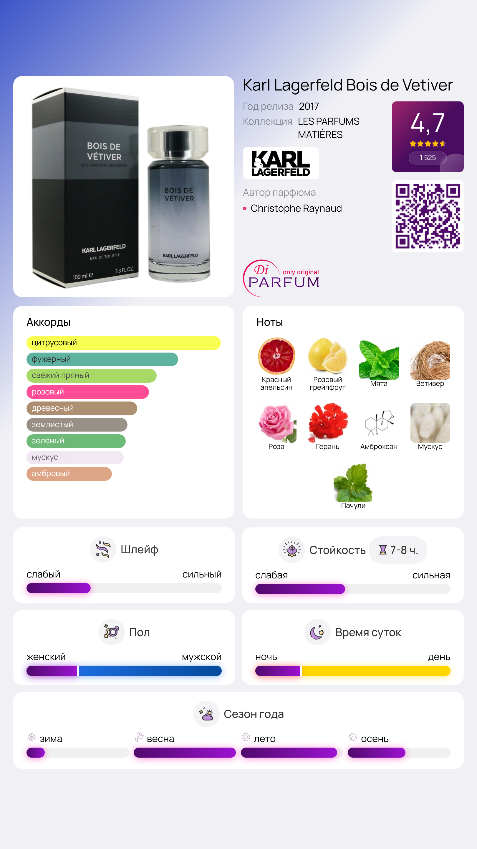 Известный дизайнер Karl Lagerfeld поражает ценителей моды не только элегантной одеждой и аксессуарами, но также изысканными ароматами, выпускаемыми под его личным брендом. Его парфюм – мужской древесно-фужерный микс на основе цитрусовых, свежих пряностей и древесных нот. Мастером этой композиции с 2017 года стал Christophe Raynaud. Сочетание красного апельсина, розового грейпфрута и мяты радует свежим открывающим аккордом. В сердце – изобилие ветивера, розы и герани. Базовые ноты амброксана, пачули и мускуса делают аромат уютным, а его высокое качество не вызывает сомнений.