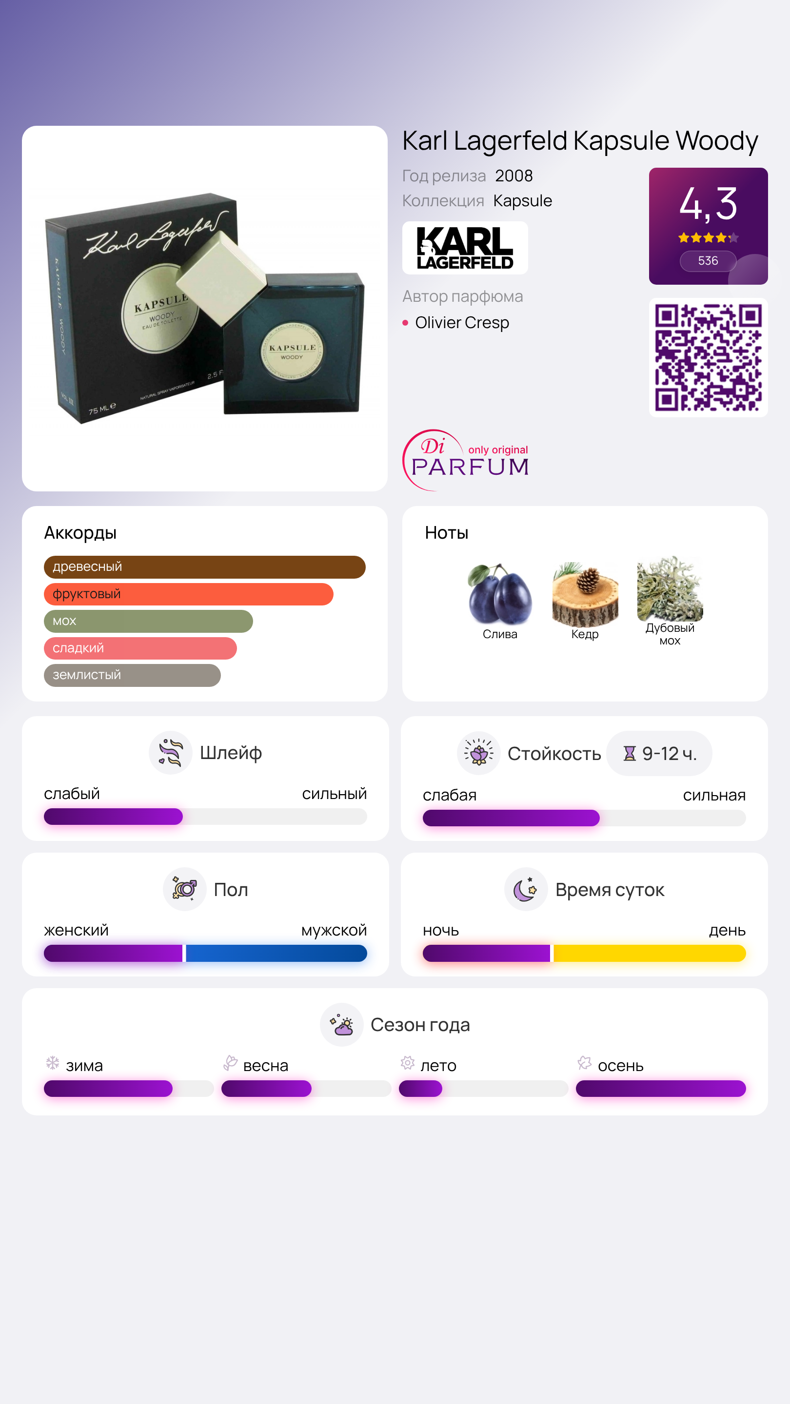 Новая линейка ароматов Kapsule, представленная Карлом Лагерфельдом, включает в себя три варианта: Kapsule Light, Kapsule Woody и Kapsule Floriental. Эти ароматы подходят как мужчинам, так и женщинам. Kapsule Woody, разработанный парфюмером Оливье Креспом, несмотря на свою универсальность, скорее предназначен для мужчин: здесь переплетаются ноты мха и кедра, дополненные нежными оттенками сливы. Этот аромат мягкий и деликатный, он подчеркнет стиль и изысканность своего владельца.