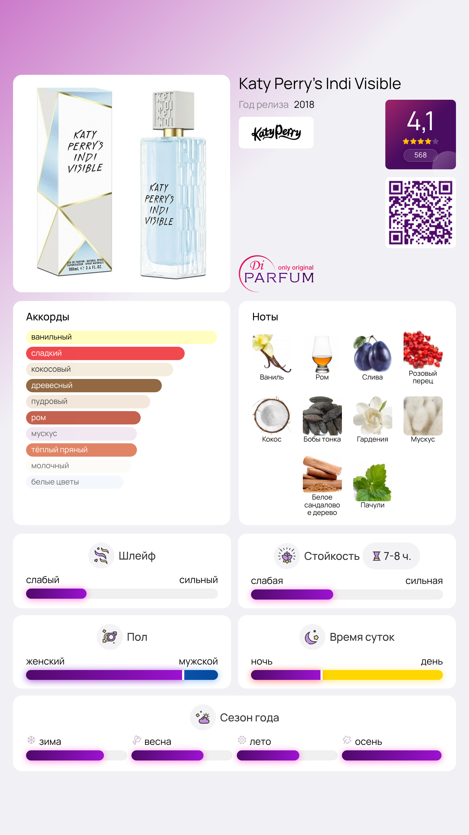 Indi Visible - это уникальная восточная парфюмерная композиция от Katy Perry, которая вдохновляет к гордости за свою индивидуальность и стремление к саморазвитию. Аромат открывается яркими фруктовыми и нежными цветочными нотами, сдобренными восточными специями. Артистка Кэти Пэрри воплотила в этом аромате свою мощную энергию и шарм, наполнив его социальным посланием и любовью. Ванильный ром, сочная слива, молочный кокос и дымный тонка - все это создает гармоничный букет, подчеркнутый шлейфом из сандалового дерева, пачули и мускуса.