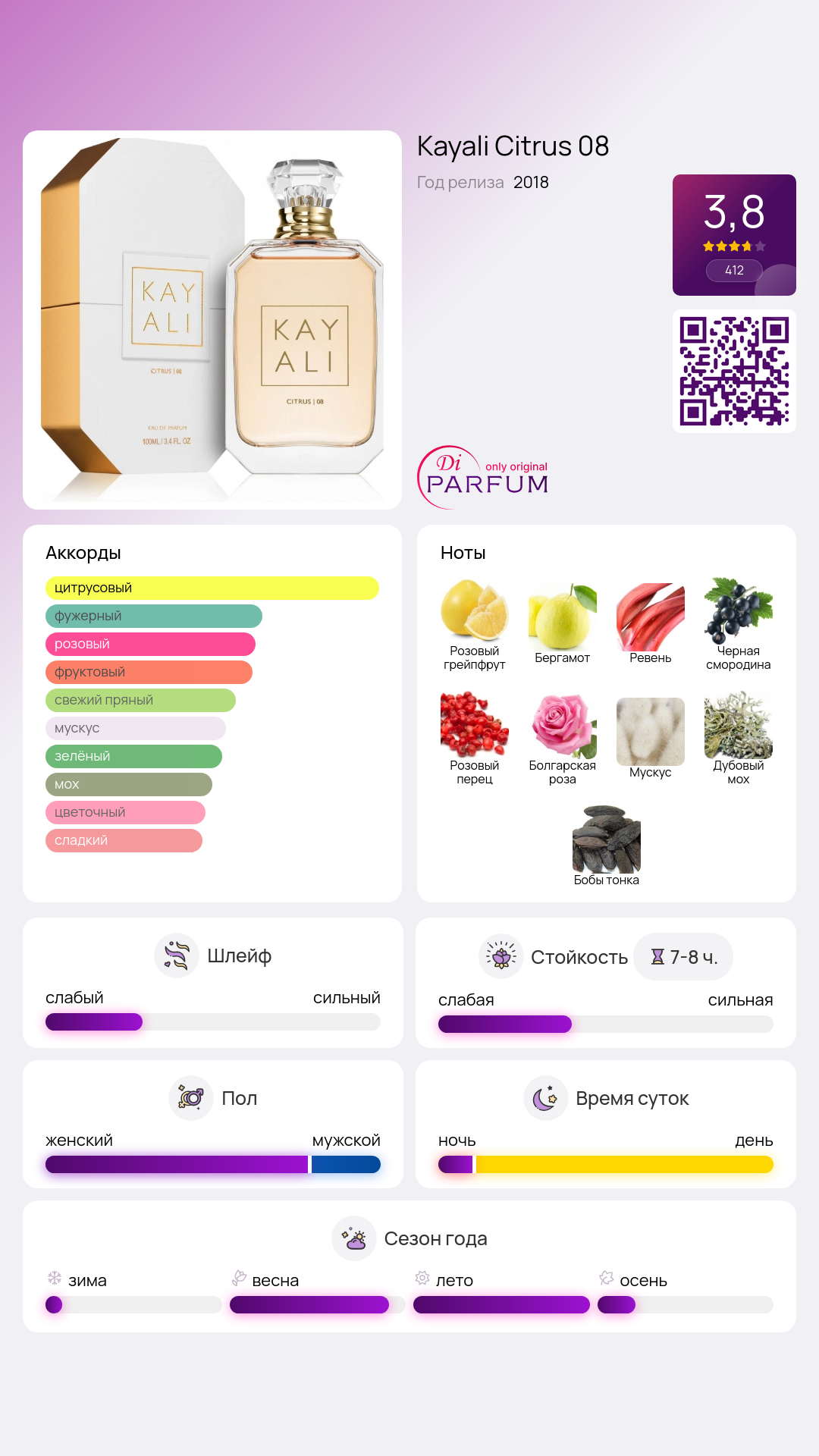 Citrus 08 от Kayali Fragrances — это цитрусово-ароматический парфюм для женщин и мужчин, выпущенный в 2018 году. В верхних нотах вы почувствуете яркие аккорды розового грейпфрута, бергамота, ревеня, черной смородины и розового перца. Сердце аромата наполнено великолепием болгарской и дамасской розы, а вBase notes дарят стойкость композиции, благодаря мускусу, дубовому мху и бобам тонка.