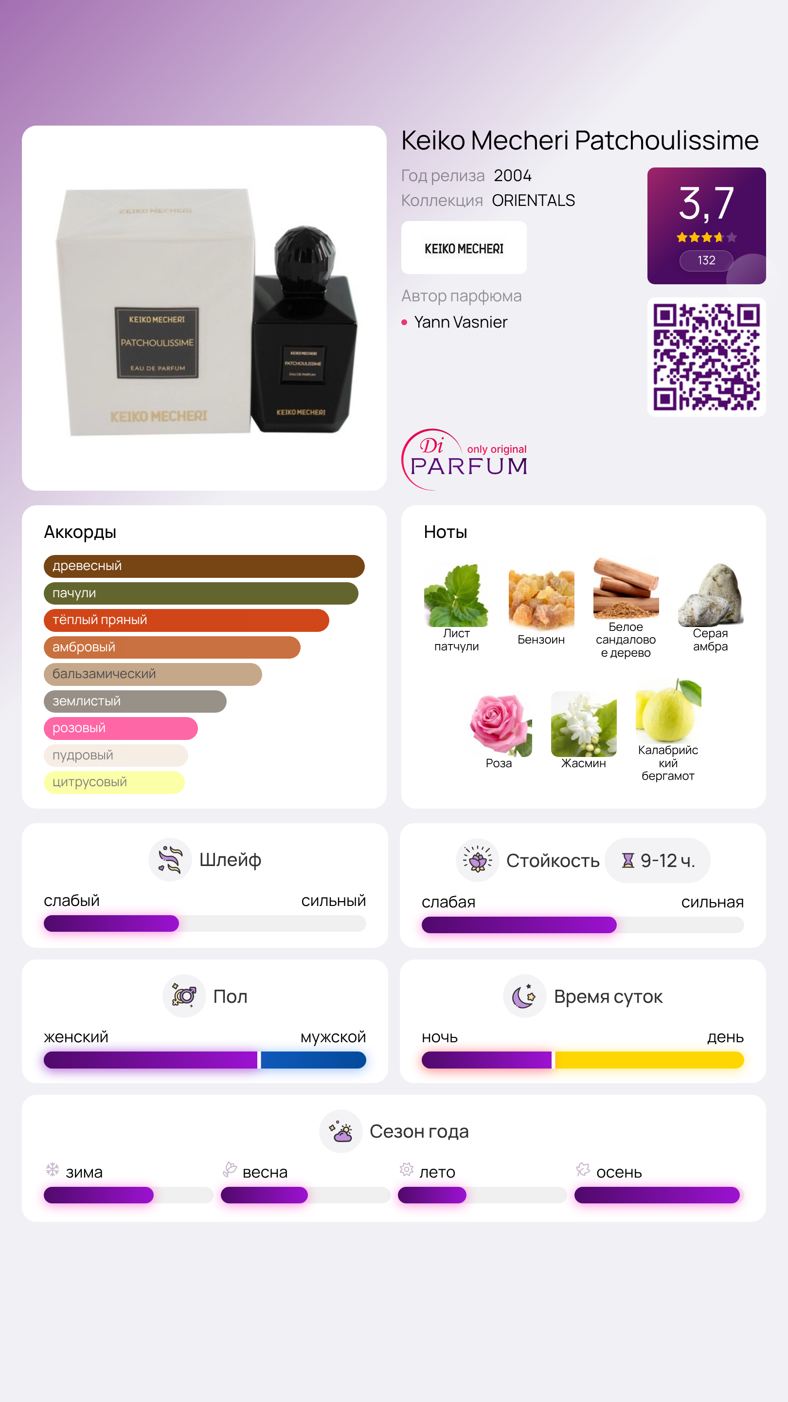Patchoulissime от Keiko Mecheri – это настоящая гимнастике утонченности, которую создает аромат пачули. Эта загадочная нота притягивает внимание как магнит. Вместе с розой и жасмином, аромат становится еще более привлекательным. Теплые аккорды серой амбры, сандалового дерева и бензоина делают его стойким и создают запоминающийся шлейф, окутывающий ауру таинственности и искушения.