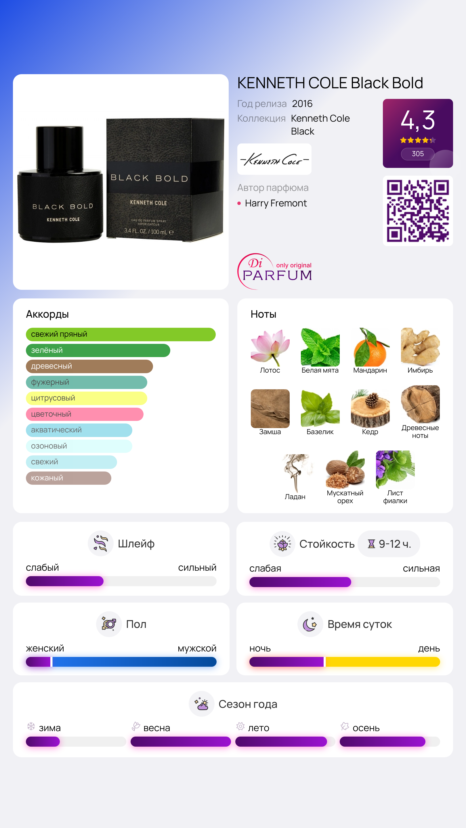 Репертуар ароматов в группе древесно-фужерных разнообразен, но особое место занимает Black Bold от Kenneth Cole. Этот аромат, созданный в 2016 году великим парфюмером Гарри Фремонтом, стал настоящим открытием. Выпущенный в элегантном черном флаконе, он поражает свежестью, сочетая в себе ноты зелени, воды, имбиря, лотоса и мандарина. Базовые аккорды базилика, водяной мяты, древесины, фиалки, замши, кедра, ладана и мускатного ореха придают этому аромату особую мужественность и нежность, создавая гармонию, которая никого не оставит равнодушным.