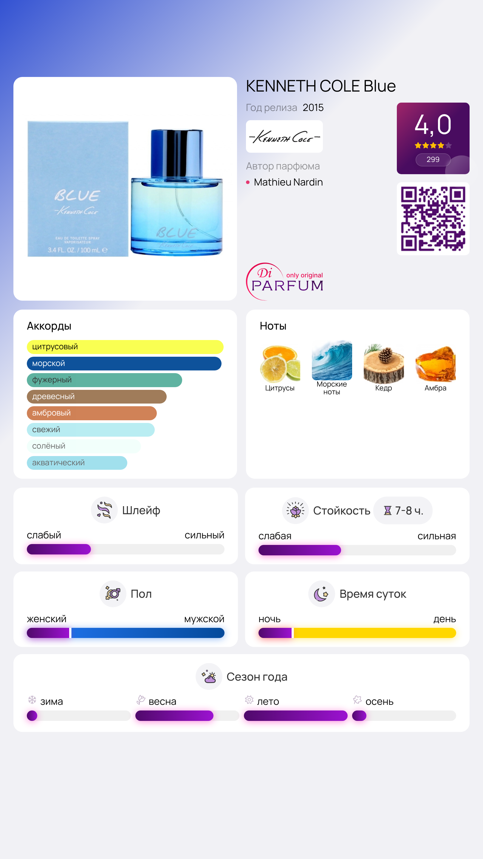 При вдыхании аромата Blue перед глазами возникает картина живого и яркого морского города, наполненного энергией. Местные жители здесь дружелюбны и любознательны, а ветер носит с собой поток новостей из разных уголков мира. Смесь цитрусовых и морских нот пробуждает желание перемен и открытий. Древесно-амбровая база подчеркивает стойкость и уверенность этого аромата. Выпущенный в 2015 году, он создан для современного мужчины, который не боится перемен и хочет избежать рутины.