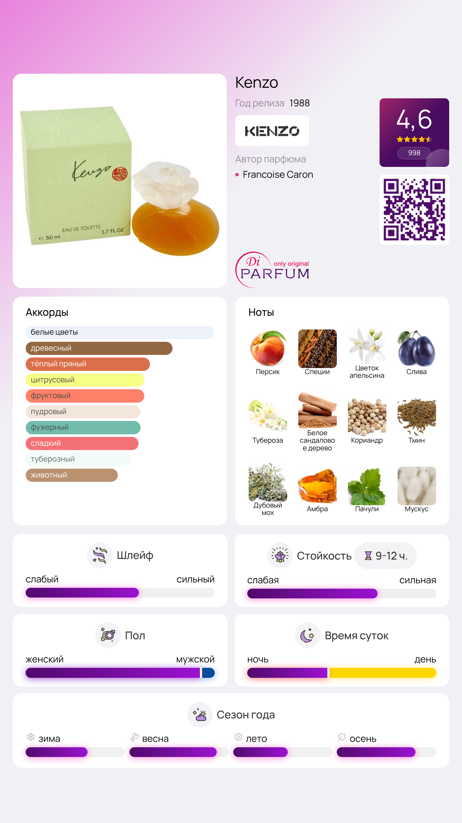 Kenzo – это утонченный и живой парфюм. Он давно завоевал популярность, но до сих пор не теряет своей уникальности благодаря своему особенному аромату. В композиции этого аромата можно найти нотки мандарина, фрезии, персика, жасмина и сирени. Kenzo идеально подойдет для вечернего выхода, когда нужно подчеркнуть изысканность и элегантность своего образа.
