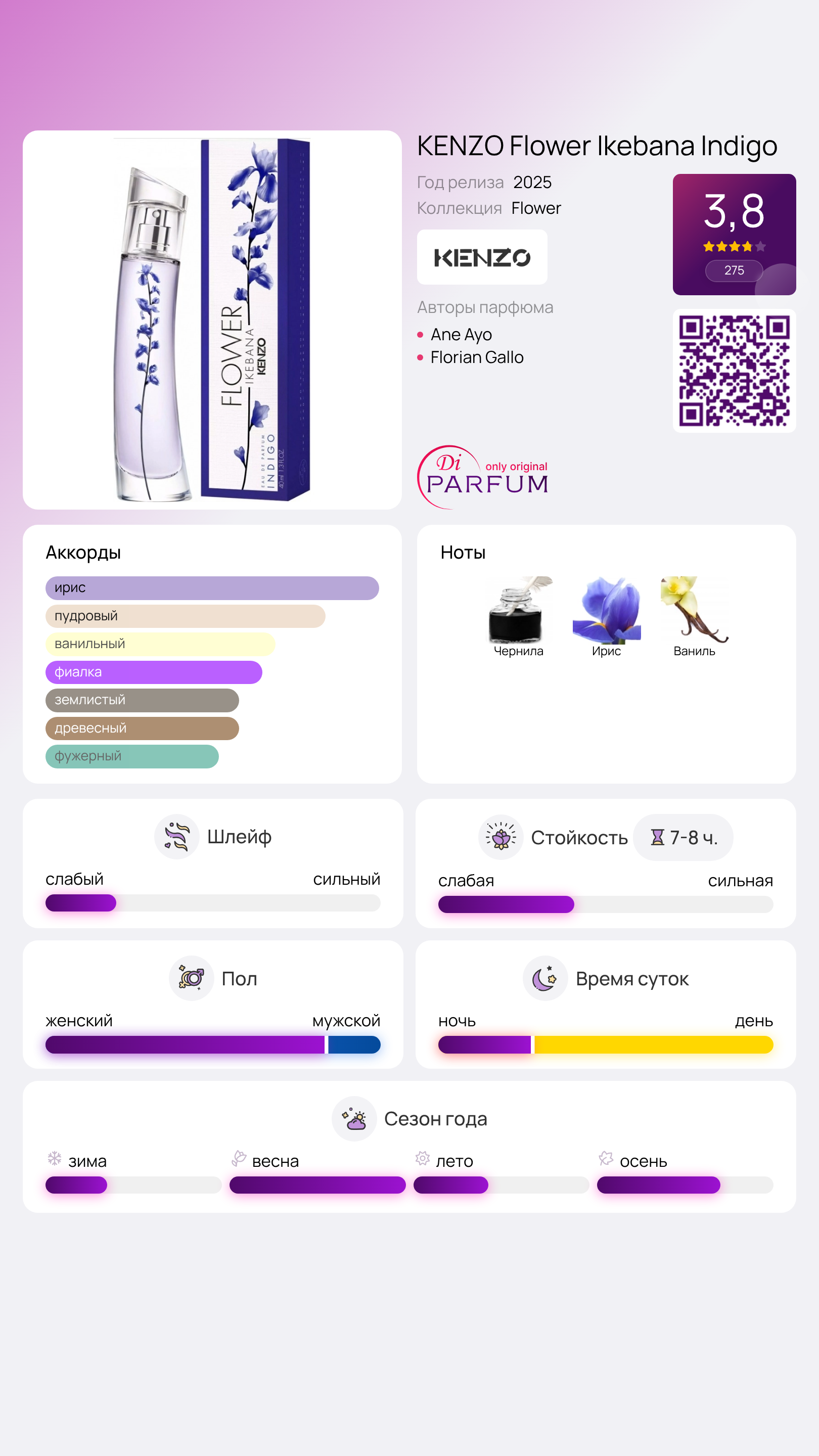 Завершающая нота ванили придаёт композиции теплую, бальзамическую сладость, которая окутывает кожу, словно уютное кимоно из окрашенного хлопка. Элегантный флакон с изображением ириса акцентирует связь природы и искусства, делая цветок символом чистоты и линий. KENZO Flower Ikebana Indigo предназначен для тех, кто ищет в парфюмерии глубину и вневременную красоту.