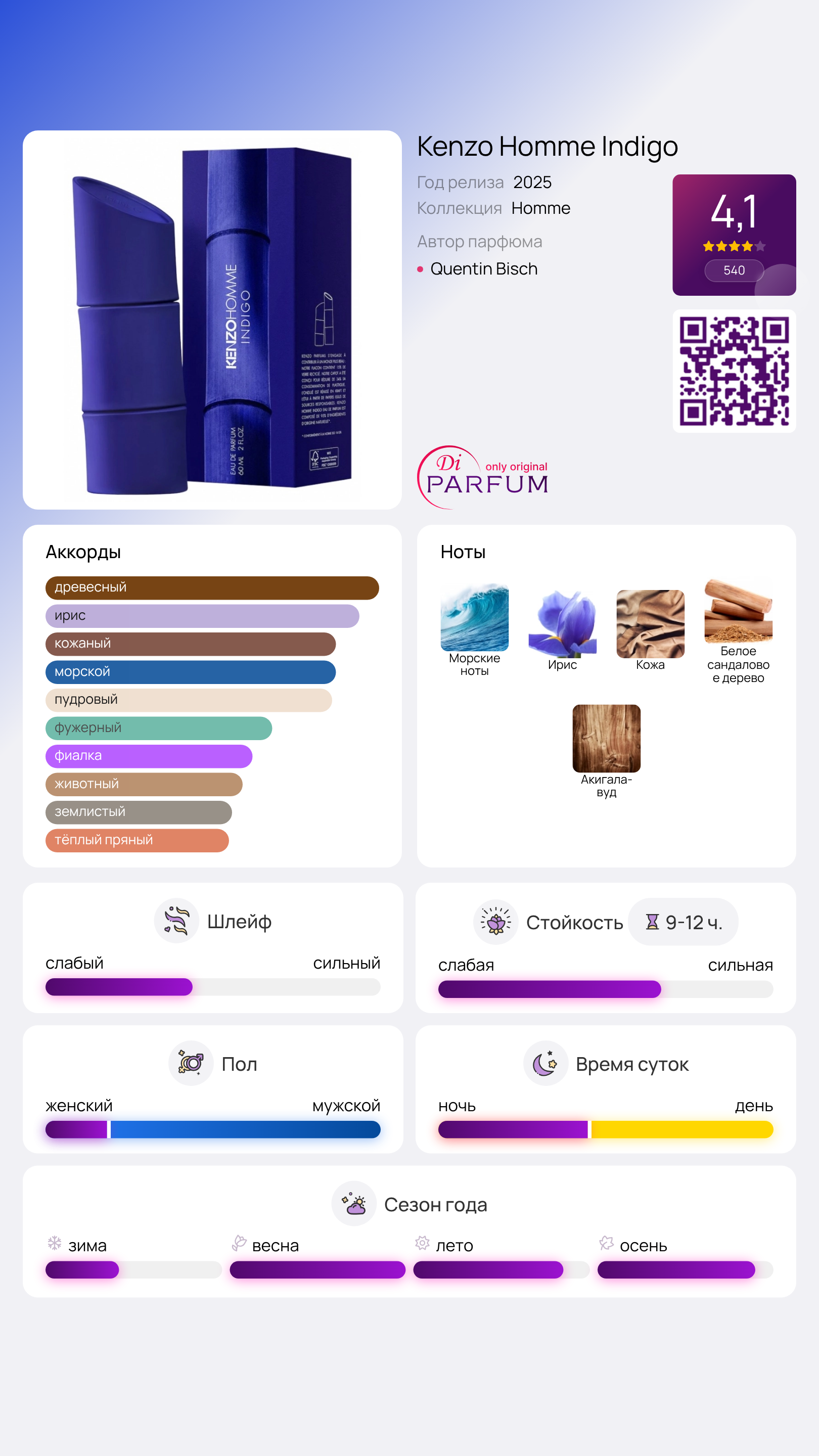 Kenzo Homme Indigo от Kenzo — это древесно-водный аромат для мужчин, который обещает стать настоящим хитом. Официальный релиз данного парфюма запланирован на 2025 год, а его создание стало заслугой талантливого парфюмера Квентина Биша.