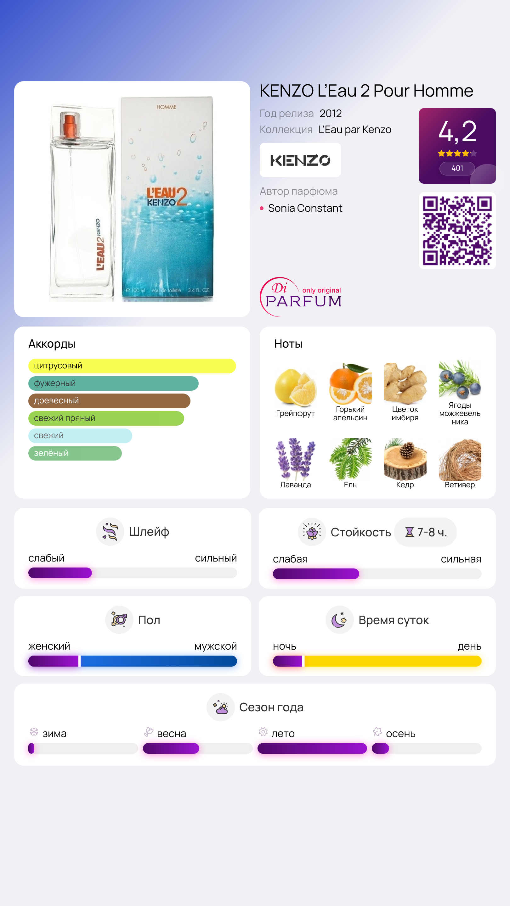 Для многих ценителей духов Kenzo L’Eau 2 Pour Homme стал настоящим открытием, разрушив стереотипы об одеколонах. Средняя стойкость этого аромата делает его идеальным для повседневного ношения, не загружая лишними нотами, а лишь даруя свежесть апельсина и древесных аккордов.