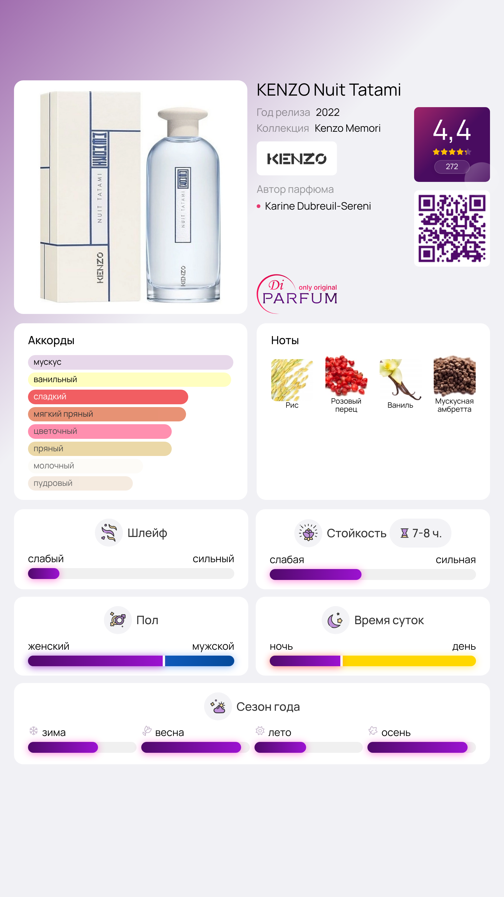 Nuit Tatami от Kenzo — это восточно-ванильный аромат для женщин и мужчин, который был представлен в 2022 году. За создание этого парфюма отвечает известный парфюмер Карин Дюбреиль-Серени. В верхних нотах ощущается нежный рис, в сердце раскрываются ноты розового перца, а базу составляют тёплая ваниль и амбретта (мускусный мальва).