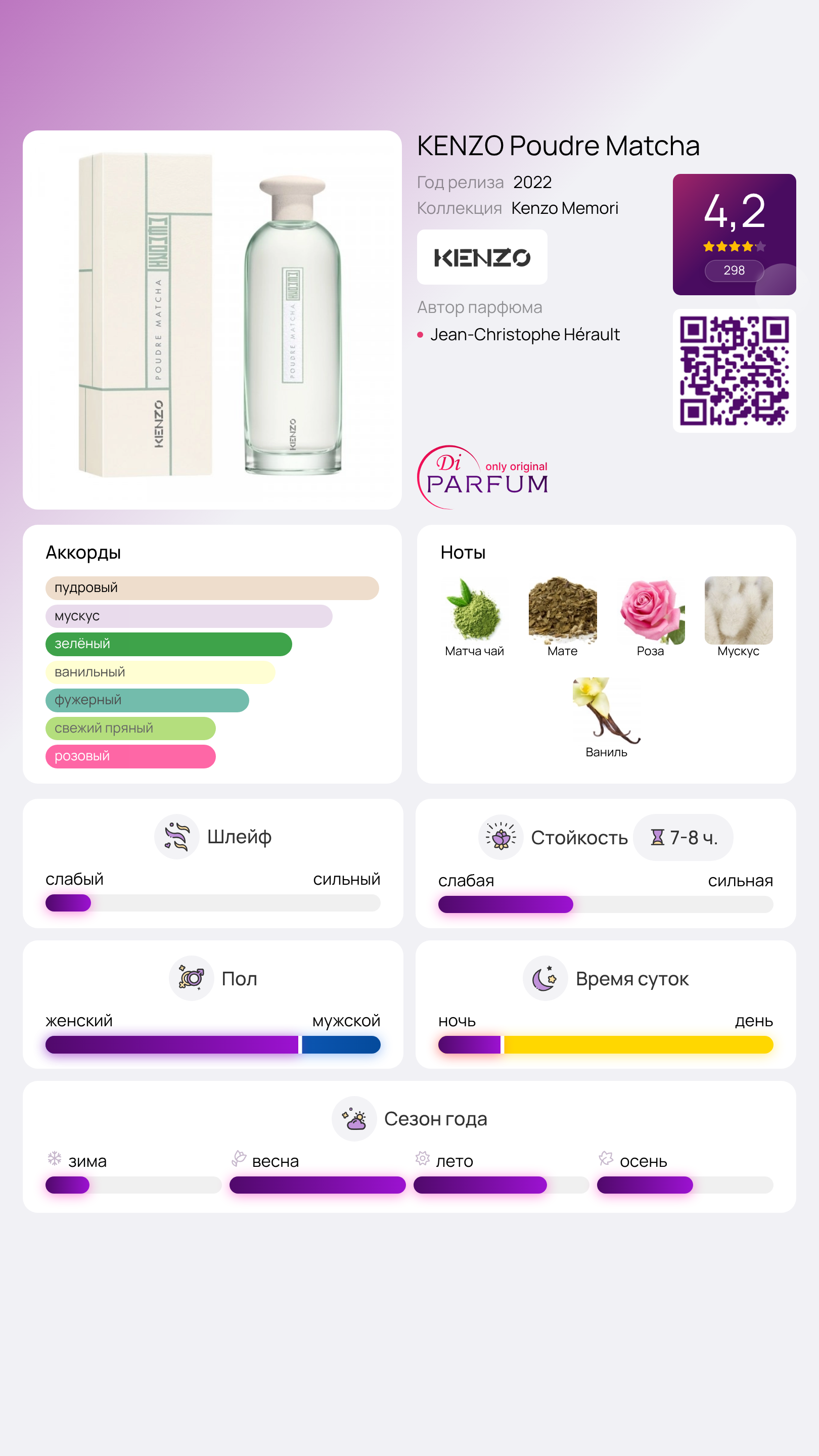 Оригинальные ноты чая звучат уютно и оригинально, принося легкую долю ностальгии и яркие воспоминания. Парфюм Poudre Matcha от KENZO был выпущен в 2022 году в рамках коллекции Memori, посвященной «японским корням» основателя бренда. Дизайн флакона, выполненного в пастельных зеленых тонах, напоминает флягу для саке, а колпачок – кам