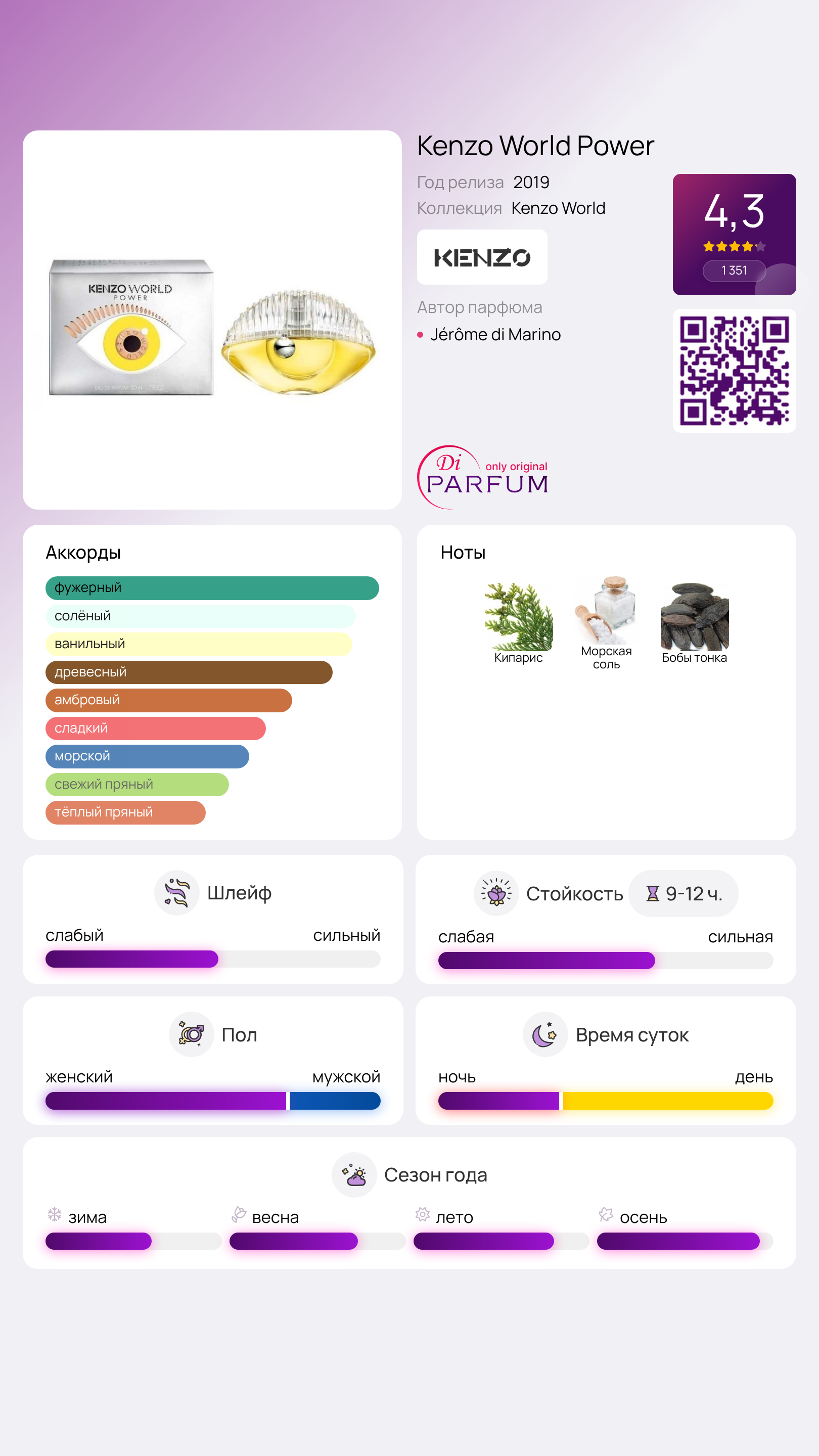 Начальная нота аромата – кипарис, после которой открывается сердце с загадочной морской солью, играющей оттенками при разной температуре. Завершает этот букет аромата база из бобов тонка, придавая ему нежность и запоминающийся шлейф.
