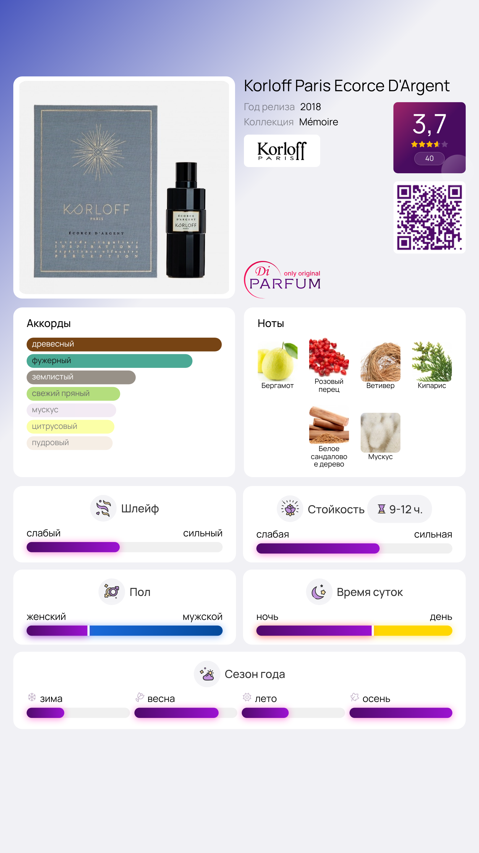 Ecorce D'Argent - это изысканный унисекс-парфюм, выпущенный в 2018 году ювелирным брендом Korloff Paris в рамках коллекции Mémoire. Парфюмеры вдохновились атмосферой Санкт-Петербурга, его величественными дворцами и неповторимой энергией. Начальные ноты парфюма – свежий бергамот с легкими штрихами розового перца. В сердце композиции распахивается пьянящий ветивер с хвойными оттенками кипариса. В шлейфе звучат благородные аккорды сандалового дерева, добавляя аромату глубину и многогранность. Мускус усиливает каждую ноту, делая парфюм притягательным и чувственным. Корофф Париж Ecorce D'Argent подчеркнет ваш образ, добавив стиля и привлекательности. Универсальный аромат подходит для любого времени года и ситуации - от повседневности до романтики.