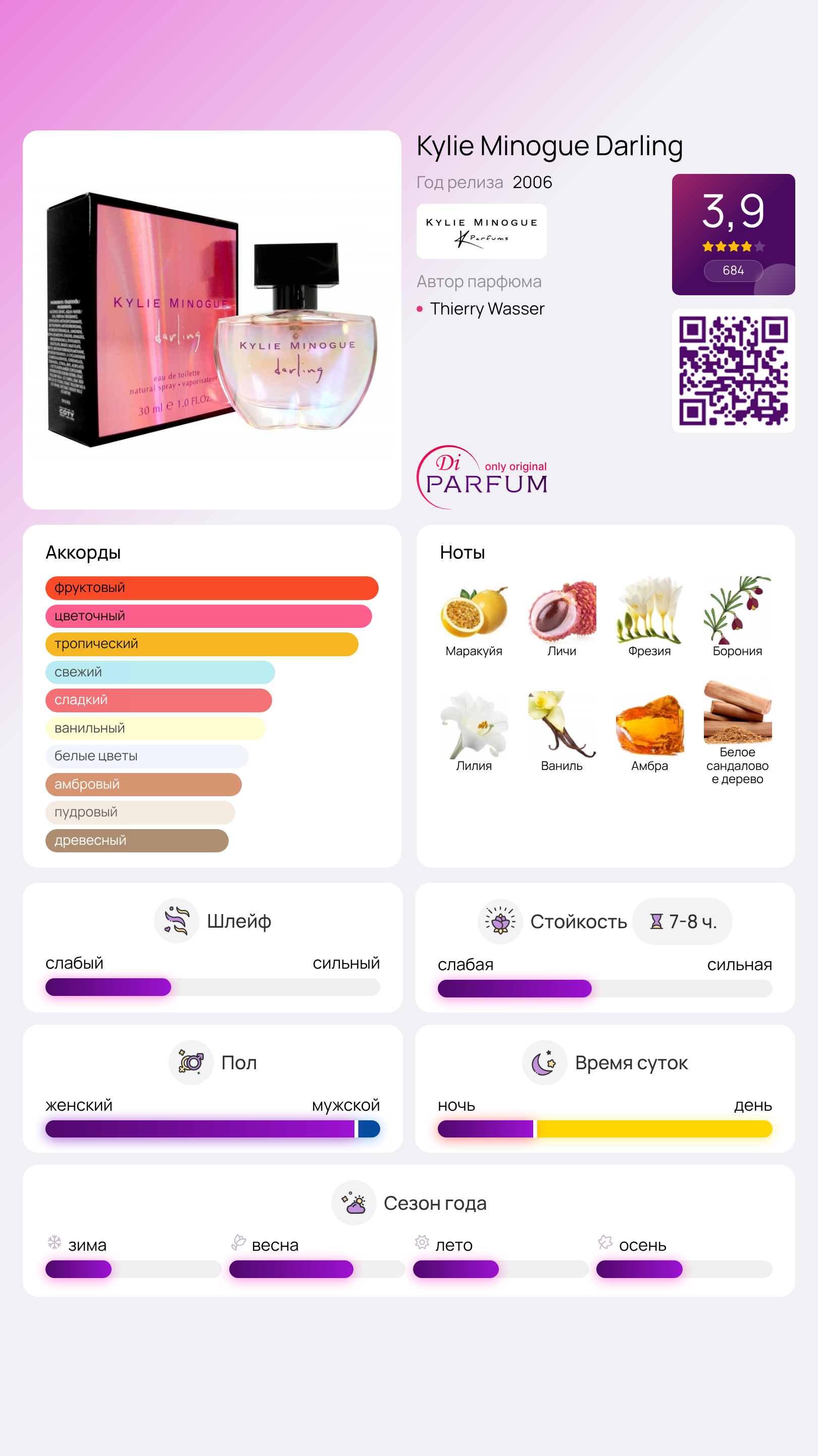 Известная певица и успешная предпринимательница Кайли Миноуг впервые представила на рынке свою новую коллекцию парфюмерии под названием Darling. Аромат символизирует характер женщины настоящего времени: сильного, но в то же время нежного и чувствительного. Привлекательный и многогранный букет ароматов включает легкие завораживающие ноты фрезии и личи, чувственный сандал, нежную белую лилию и ваниль. Присутствие австралийского цветка Борони делает этот парфюм изысканным и благородным. Флакон этого изысканного парфюма, украшенный подписью "Darling", олицетворяет изысканную элегантность и тонкое знание классического стиля. В верхних нотах: маракуйя, личи, фрезия. Средние ноты: борония и лилия. Базовые ноты: сандал, ваниль и амбра.