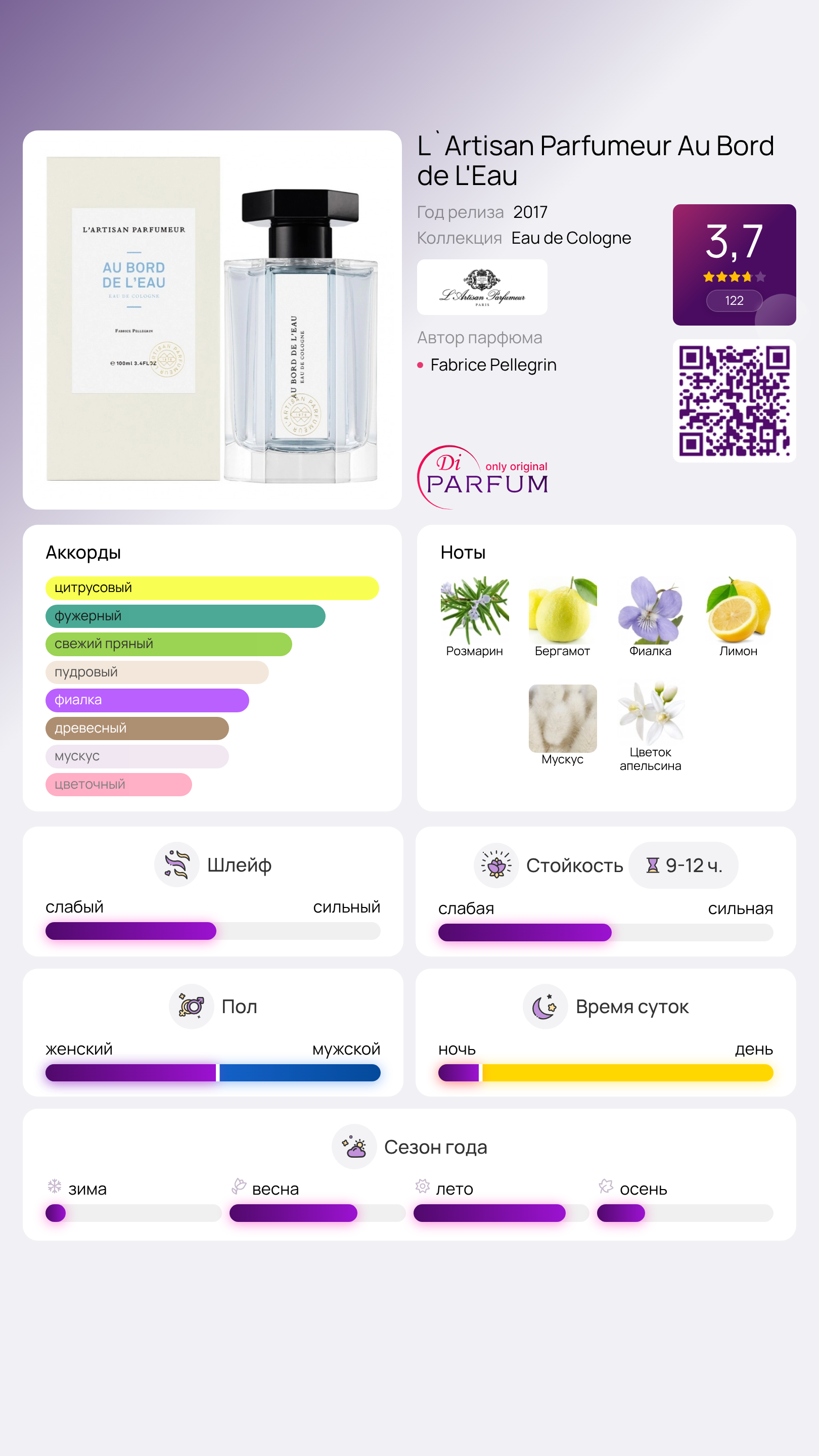 Перевод названия парфюма Au Bord de L'Eau с французского на русский означает "У Края Воды". Этот аромат от популярного французского бренда L'Artisan Parfumeur создан талантливым парфюмером Фабрисом Пеллегреном под вдохновением от произведений импрессионистов. Микс нот стал напоминать хрустальную вазу – изящный, прозрачный, милый и уютный, как творения Клода Моне.