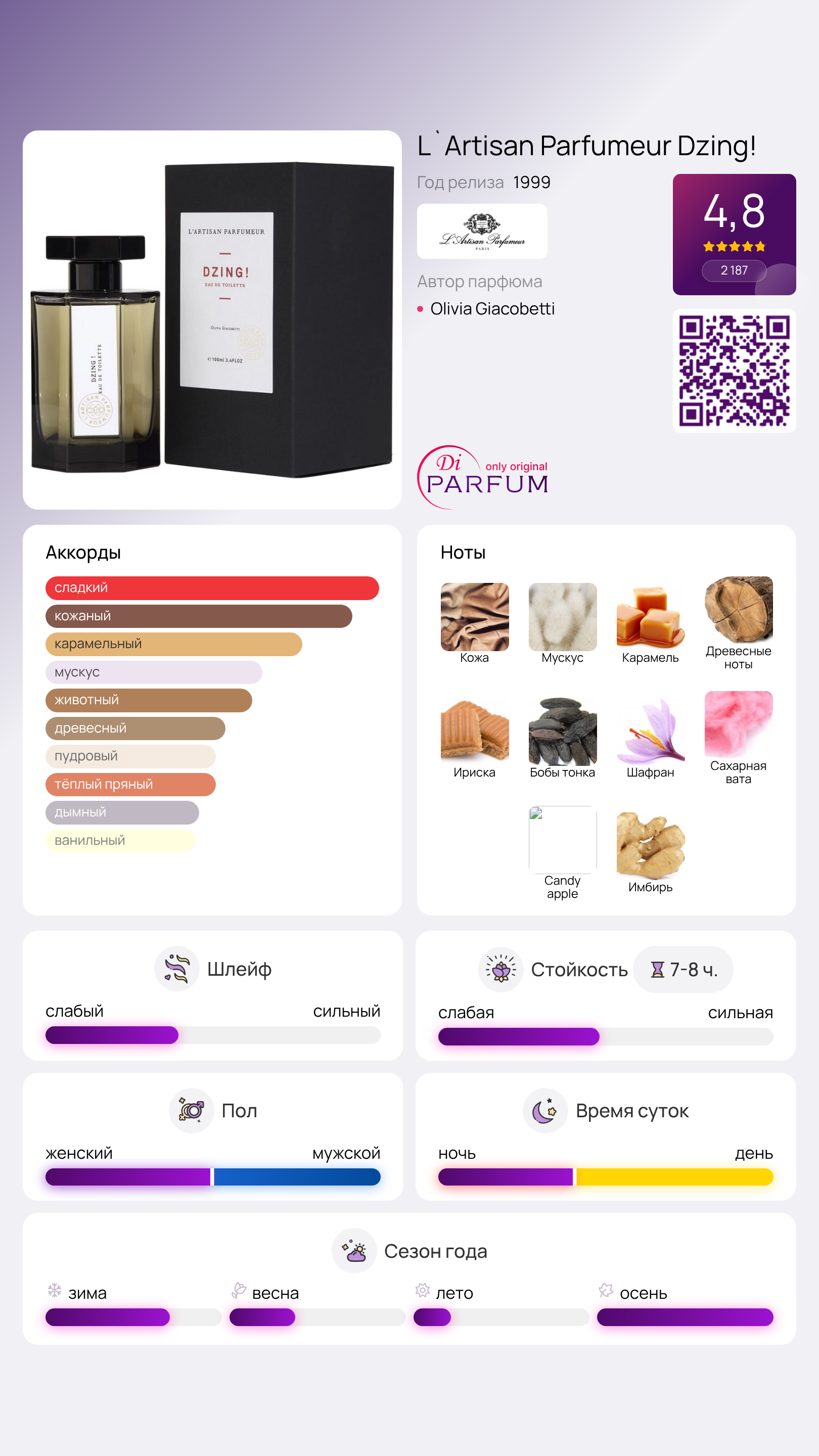Dzing! – это свежая история о Принцессе Цирка, рассказанная L’Artisan Parfumeur. Каждый вдох Dzing! приоткрывает перед нами картину бесстрашных наездниц, воздушных жонглеров и храбрых укротительниц. Встреча с цирком всегда наполняет нас невероятным восторгом, предвкушением счастья и веселым настроением. И, конечно же, неотразимый аромат настоящего шоу: запах свежих опилок, потертых кожаных седел, сладких леденцов и ароматной ваты. Dzing! – голос детства! В самом начале звучат ноты: ирис, роза и нарцисс. В "сердце" композиции раскрываются корица, имбирь и шафран. А в основе: Перуанский бальзам, кастореум, кожа, бензоин, тонка-бобы и мускус с ноткой ириса.