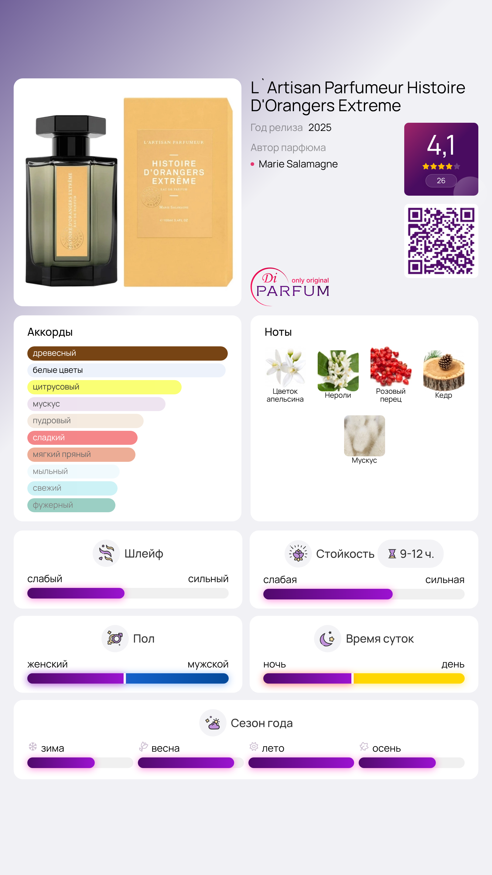 Histoire d'Orangers Extrême от L'Artisan Parfumeur — это цитрусовый аромат, предназначенный как для женщин, так и для мужчин. Новый парфюм, который был запущен в 2025 году, стал настоящей находкой для любителей свежих и ярких ароматов.
