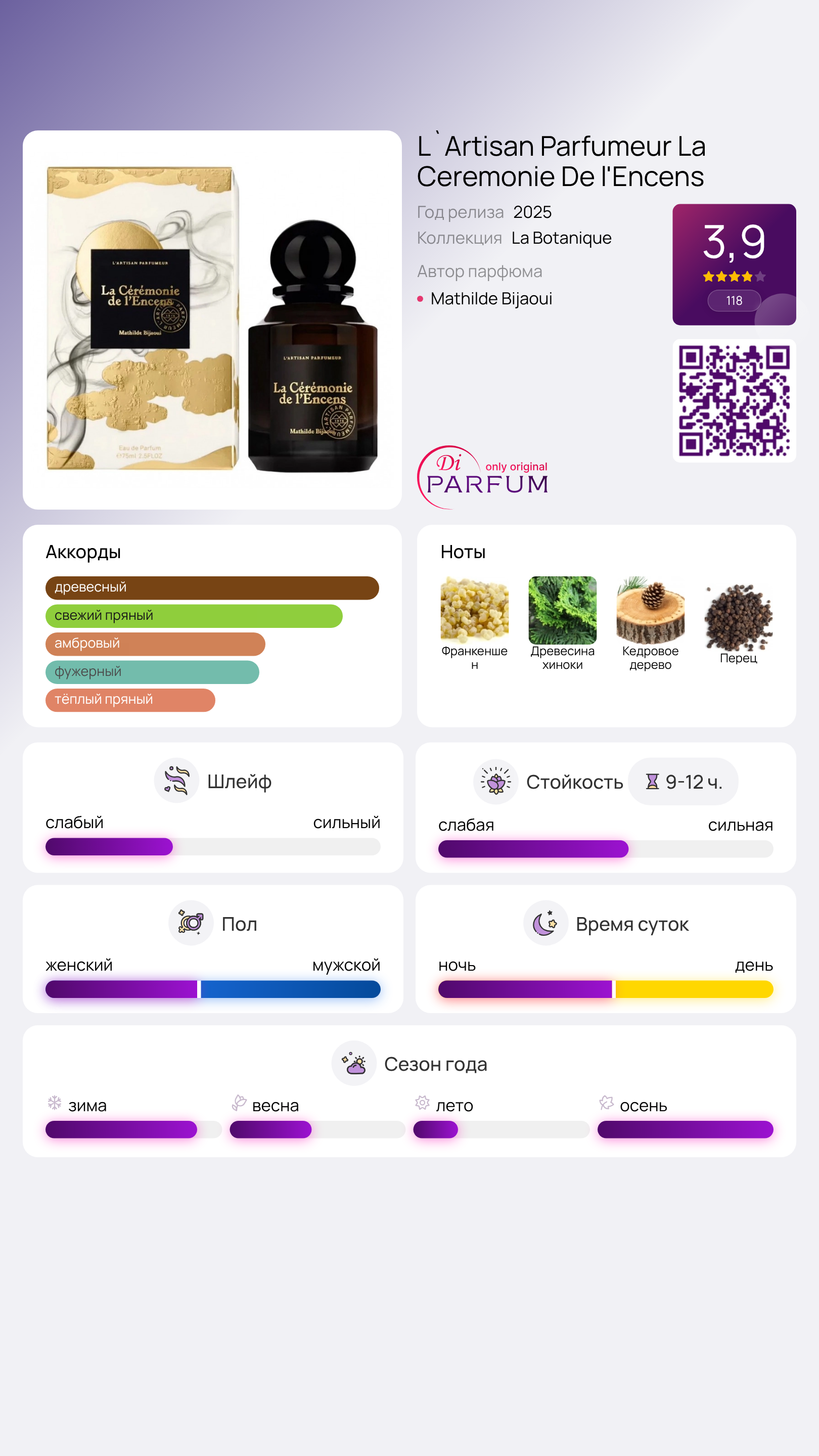 La Cérémonie de l'Encens от L'Artisan Parfumeur — это восточно-древесный аромат для мужчин и женщин, который был представлен на рынке в 2025 году. За создание этого уникального шедевра стоит талантливый парфюмер Mathilde Bijaoui.