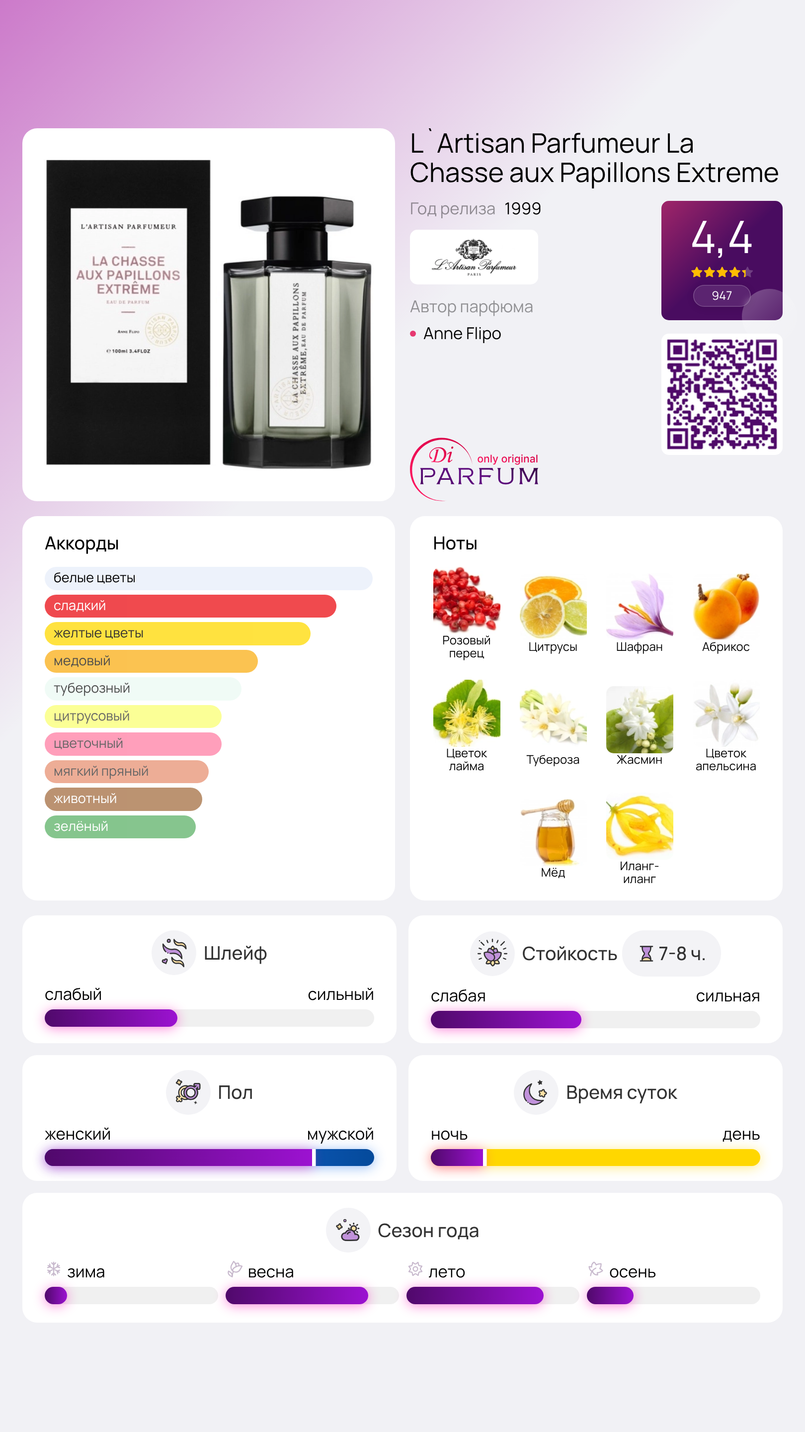 La Chasse aux Papillons Extreme от L'Artisan Parfumeur – это более интенсивная версия популярного аромата La Chasse aux Papillons. Этот парфюм наполнен нотами нежных белых цветов, согретых лучами солнца. Пряности добавляют неповторимый шарм, а прохладный оттенок розового перца придает свежесть и помогает раскрыть всю гамму эмоций.