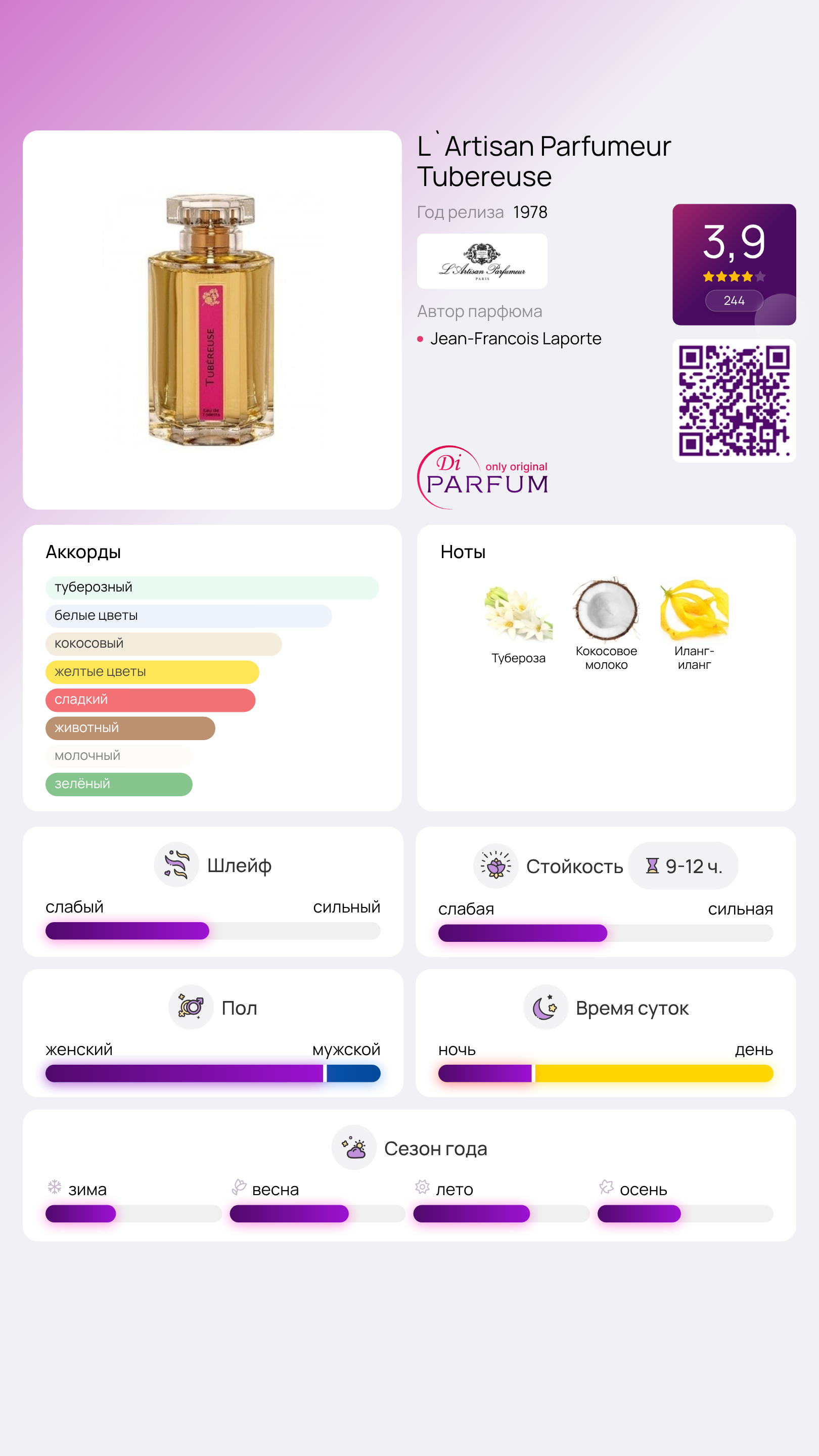 Если вам нравится аромат туберозы, то парфюмерная композиция Tubereuse от L'Artisan Parfumeur дарит этому цветку совершенно новое и интересное звучание. Вместо классического кремового аромата, тубероза раскрывается здесь с новыми, необычными оттенками. В верхних нотах Tubereuse от L'Artisan Parfumeur тубероза сочетается с пряным кардамоном и сладким манго, а розовый перец добавляет пикантности этому цветочно-фруктовому букету. В сердце композиции звучат ноты апельсина, иланг-иланга и розы. А завершает этот аромат сладковатая основа с мускусными, древесными и бальзамическими аккордами.