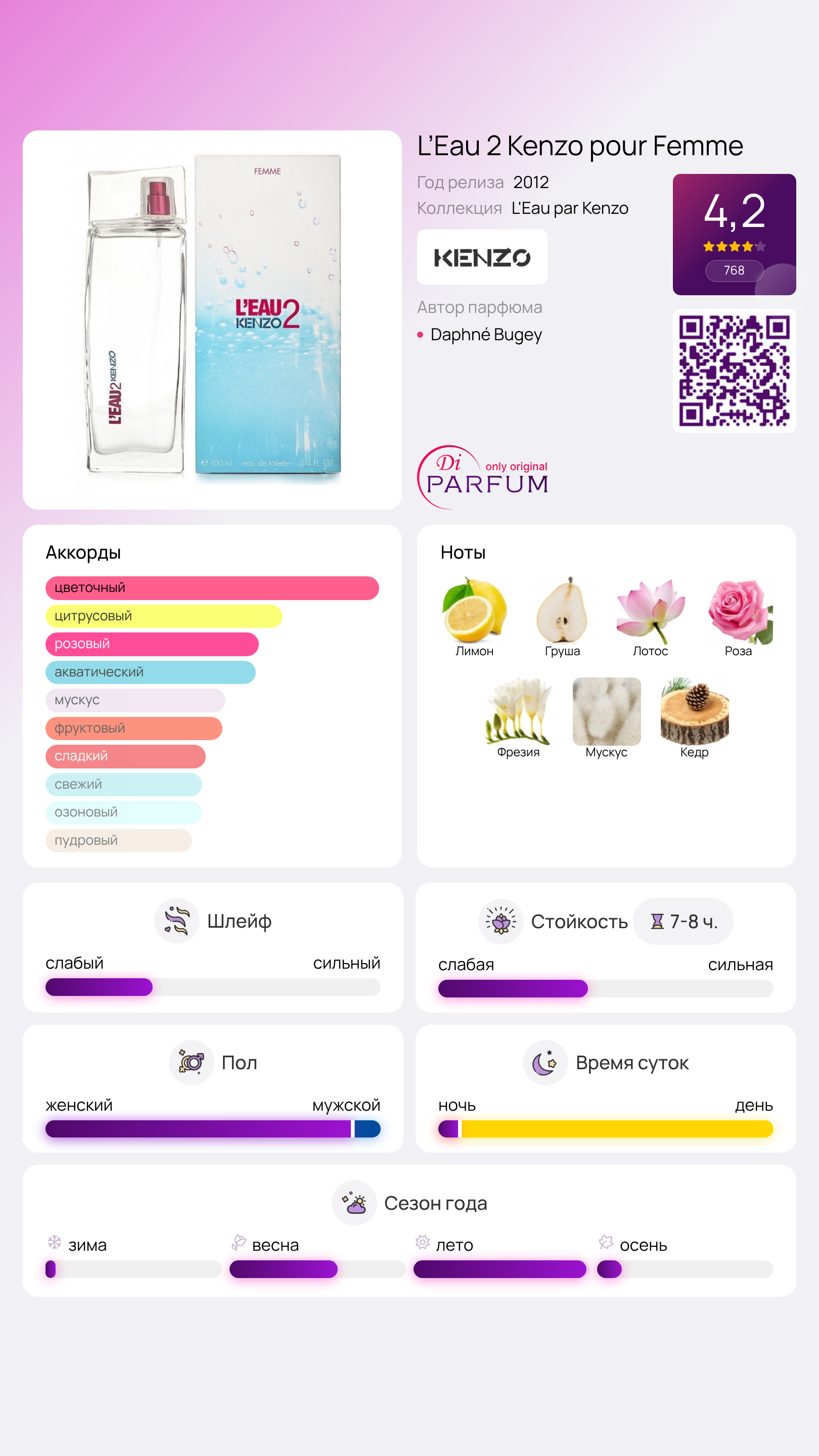 Аромат L’Eau 2 Kenzo pour Femme — это идеальный выбор для летнего сезона, в полной мере передающий свежесть и чистоту воды. Он попадает в список самых популярных женских парфюмов на лето. Этот аромат ненавязчив и легок, не оставляя за собой слишком яркий шлейф. Сочетание груши с лимоном в верхних нотах, цветочного трио из розы, белой фрезии и лотоса в сердце, а также базовые ноты белого кедра и мускуса создают элегантный минимализм. В результате получается аромат с воздушным эффектом, который освежает даже в знойные летние дни.