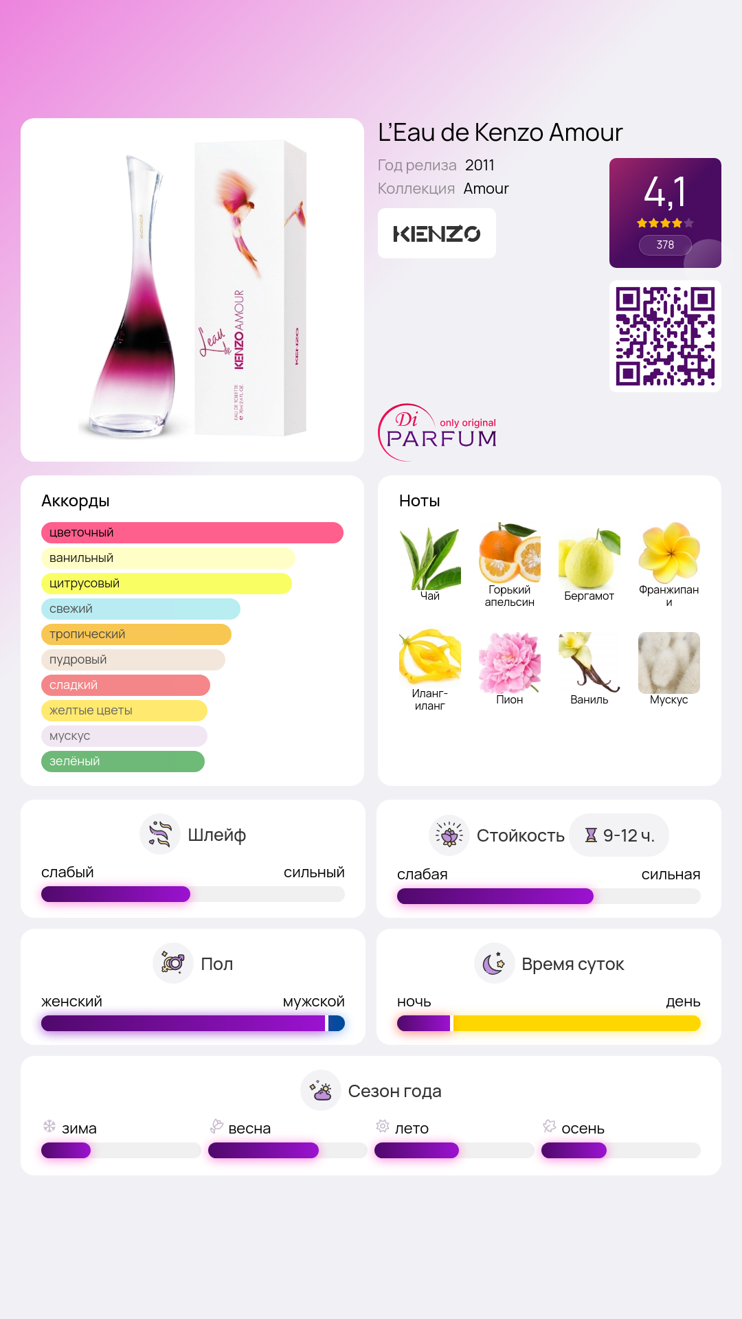 Аромат входит в цветочную семью, что делает его идеальным выбором для весенне-летнего сезона, когда цветочные ноты особенно актуальны. Придерживаясь его уникальности, L'Eau de Kenzo Amour станет настоящей находкой для всех любителей парфюмерного искусства.