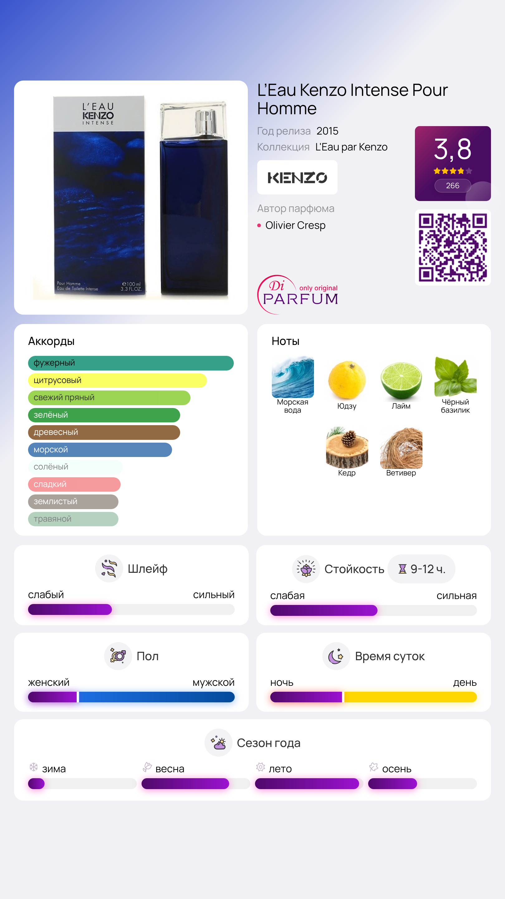 Kenzo's Intense Pour Homme fragrance embodies the essence of a true men's cologne designed for the rapidly changing world. It features a bold fougere character infused with cool splashes of the sea breeze, making it perfect for spending hours in the gym or leisurely strolling along a summer promenade, admiring the setting sun. The composition, typical of most modern Kenzo scents, is minimalist. It opens with a trio of marine freshness, zesty lime, and exotic yuzu, reminiscent of bitter mandarin. In the spicy core, only black basil stands out, rising to the top of the bouquet and lingering until the fragrance fades away. The base of vetiver and white cedar, against the backdrop of such vibrant notes, is subtle and practically imperceptible. For an active summer spent outdoors, a man is unlikely to find anything better than L'Eau Kenzo Intense Pour Homme. This scent is not as overpowering as similar lines from competitors, yet it still conveys the image of a sporty and well-groomed man who is aware of all his virtues and confidently presents himself in public.