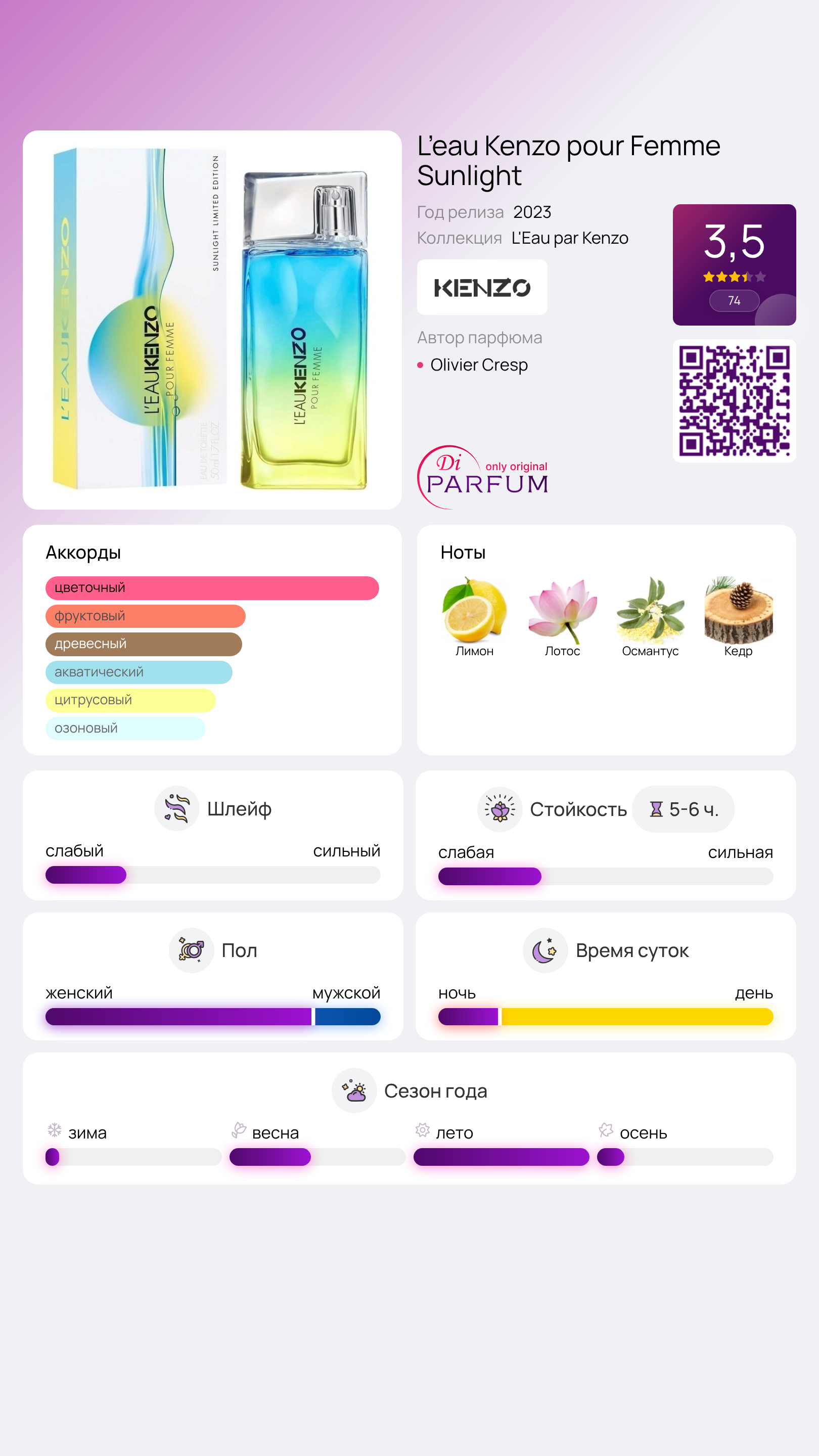 Инновационный аромат L’eau Kenzo pour Femme Sunlight представляет собой захватывающую цветочную водную композицию, вдохновленную ярким букетом лотосов, раскрывшихся на протяжении летнего утра. Парфюмерам помогла вдохновляющая щедрость природы, чтобы создать свежий и радостный эликсир. В его основе сочетание цитрусовых и цветочных нот оживляет чувства. Легкая горечь лимона сочетается с ароматом кедра, создавая уникальное ароматное сочетание. Османтус и лотос придают аромату жизненную энергию и восточный шарм. Яркий и красочный аромат L’eau Kenzo pour Femme Sunlight был выпущен культовым французским брендом в 2023 году как воплощение женственности и красоты. Он насыщен на 93% натуральными компонентами, а дизайн флакона, напоминающий волны воды, окрашен в яркие цвета сапфира.