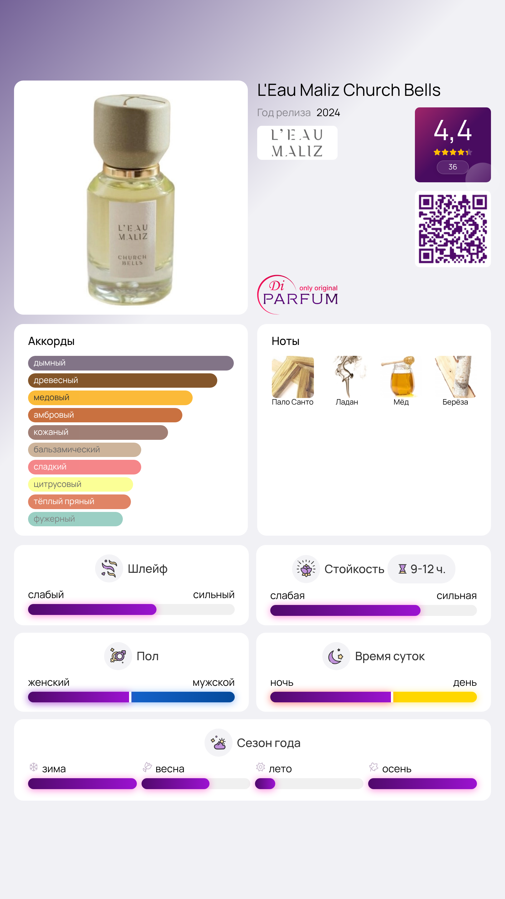 Представьте себе внутреннее убранство храма, где ладановое облако парит мистическим туманом, а запах пало санто наполняет воздух древесными, слегка сладковатыми нотами. Свечи перед иконами излучают густой аромат меда, который еще недавно хранился в восковых сотах, обращенных теперь в свечи. Вдоль стен тянется запах березовой древесины, из которой сложены лавки. Church Bells от L'Eau Maliz – это уникальное олицетворение торжественности, с оттенками меда, ладана и воска. Погрузитесь в эмоциональное путешествие, насладитесь тишиной и глубоким содержанием этого аромата, который превратит любое ваше проявление в ос