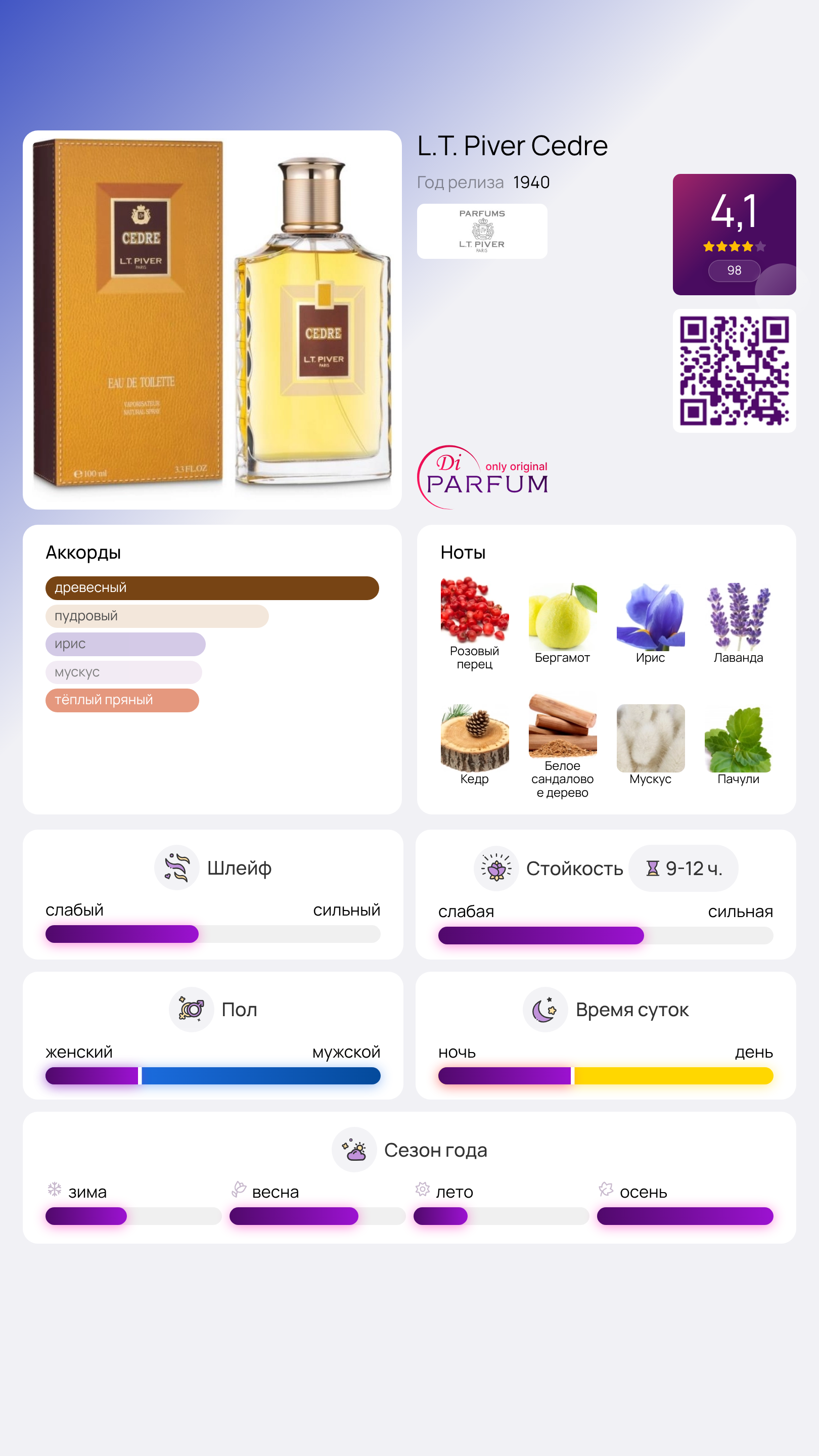 Название Cedre в переводе с французского означает "Кедр". Аромат построен вокруг характерных запахов величественного дерева. Свежесть в сочетании с пикантностью дарят ноты розового перца и бергамота, делая начало пирамиды аромата ярким и радостным. В сердце композиции распахивается лаванда, придающая прохладу и подчеркивающая хвойные аккорды. Ирис, символ королевской власти, добавляет загадочности и изысканности. Окончание аромата L.T. Piver Cedre основано на древесных нотах, где мягкий сандал, бальзамический пачули и смолистый белый кедр создают великолепное мускусное звучание.