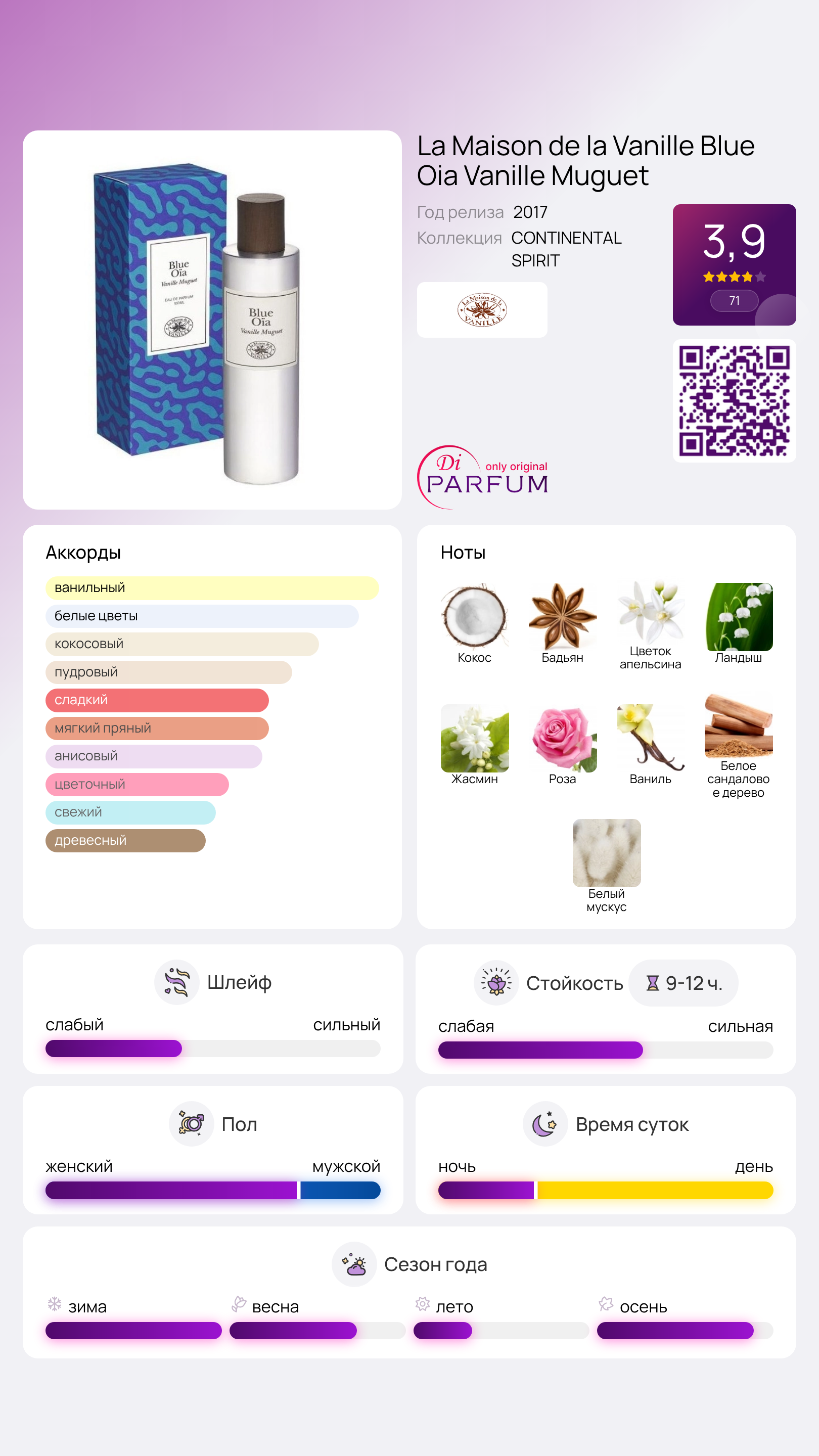 Аромат Blue Oia Vanille Muguet от La Maison de la Vanille раскрывается гармоничным сочетанием кокосовой нежности, апельсиновых цветков и аромата звездчатого аниса. Фруктово-пикантная начальная нота переходит в цветочное сердце, где звучат ноты жасмина, ландыша и розы. А завершает эту композицию классическое ванильно-мускусное послевкусие, приправленное нотами сандала.