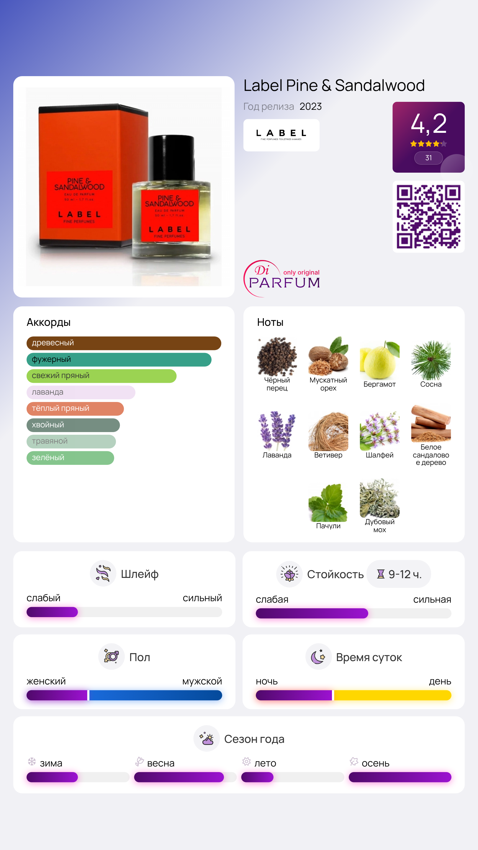 Аромат смолистой хвойной сосны напоминает прикосновение к природной красоте, а классический дубовый мох придает землистую основу лесной свежести. Сложная композиция Pine & Sandalwood от Label – это гармония древесных и травяных оттенков, раскрывающая необычную и манящую глубину.