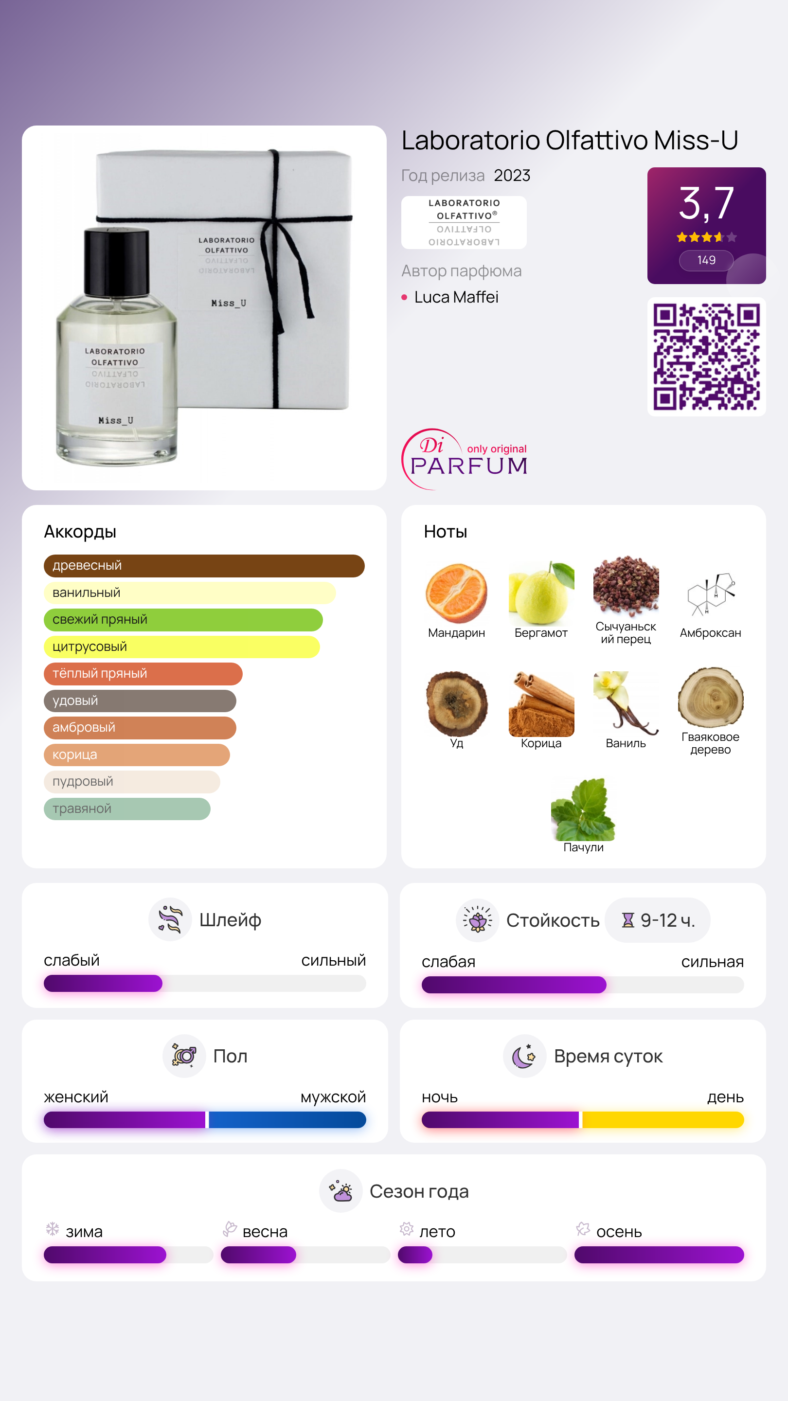 Необъяснимый пряный запах древесно-пряного парфюма Miss-U от бренда Laboratorio Olfattivo способен передать чувства без слов. По информации из пресс-релиза, этот аромат – это своего рода послание души, адресованное коже. Его послание – «я нуждаюсь в тебе, я скучаю по тебе!» Это утверждение, шепчущееся на ухо, звучит как мощное признание. Желание использовать этот аромат сравнивается с потребностью в одежде. В его композиции ощущается радость первых дней осени, время желтых и багряных листьев, и хрустальный холодок солнечного дня.