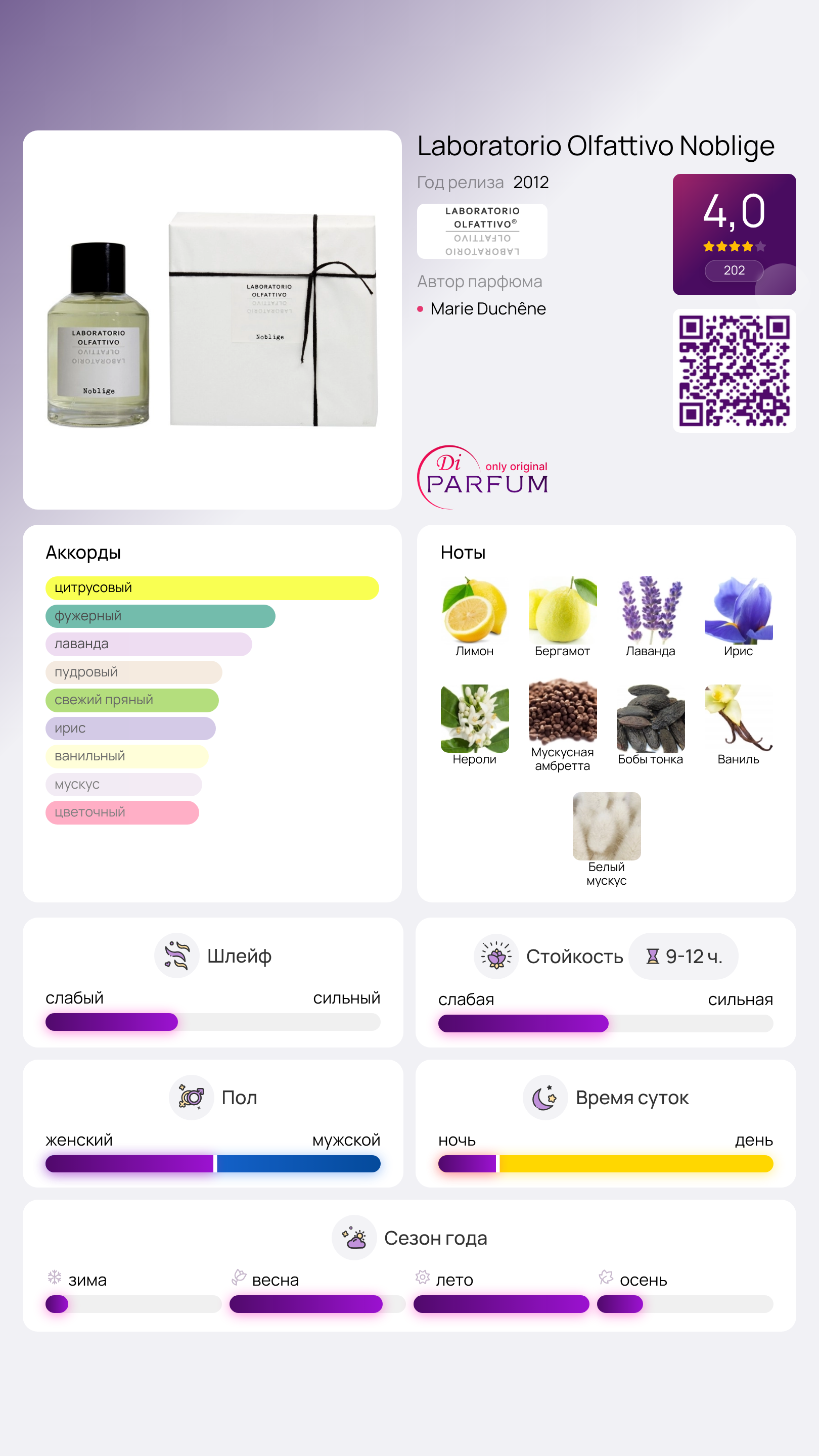 Парфюм Noblige от Laboratorio Olfattivo – это новое творение от известного нишевого бренда, которое отлично сочетает в себе традиции прошлых времен и современные тенденции. Мари Дюшен, создатель этого аромата, смог передать в нем яркую нотку свежести и натуральную красоту. В начальных нотах чувствуется сочный лимон и душистый бергамот, а в сердце раскрываются лаванда, амбретта, ирис и нероли. А завершает этот букет дымный аккорд тонка, играющий с нежными оттенками мускуса и ванили. Ноближ – это аромат, который поднимает настроение и заряжает бодростью, как ледяной душ, поэтому в жаркие летние дни он станет незаменимым спутником для своих владельцев.