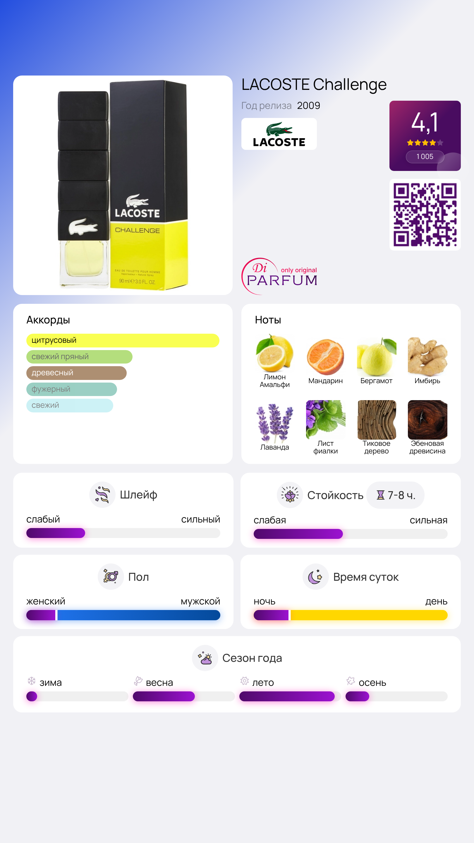 Также, как и другие ароматы бренда, Lacoste Challenge призван угодить молодым, энергичным мужчинам, готовым к различным вызовам жизни. Средняя насыщенность аромата и слегка сладковатый шлейф – не помеха. Это по-прежнему мужественный парфюм, где крепкие ноты сочетаются с моментами расслабления после трудового дня.
