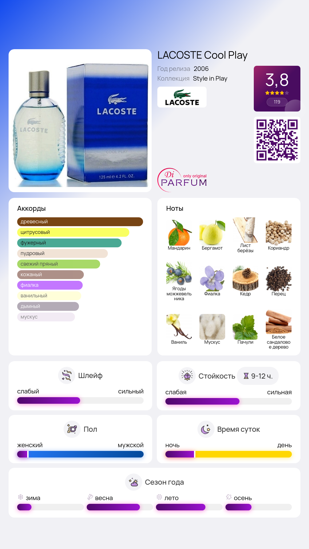 Cool Play от Lacoste – мужской парфюм с древесными и цветочными нотами, выпущенный в 2006 году. Этот аромат призван подчеркнуть темперамент и активный образ жизни современного мужчины, любящего спорт и адреналин. Освежающая композиция Cool Play от Lacoste переносит нас на утренний луг в июне, наполненный запахом зелени, трели соловьев и легкого ветерка. Свежесть и легкость раскрываются в верхних нотах кориандра, березовых листьев, мандарина и бергамота. В сердце звучат ноты можжевельника, фиалки, перца и кедра, а база парфюма воплощает в себе смесь сандала, амбры, пачули, мускуса, ванили и ветивера, оставляя приятный шлейф.