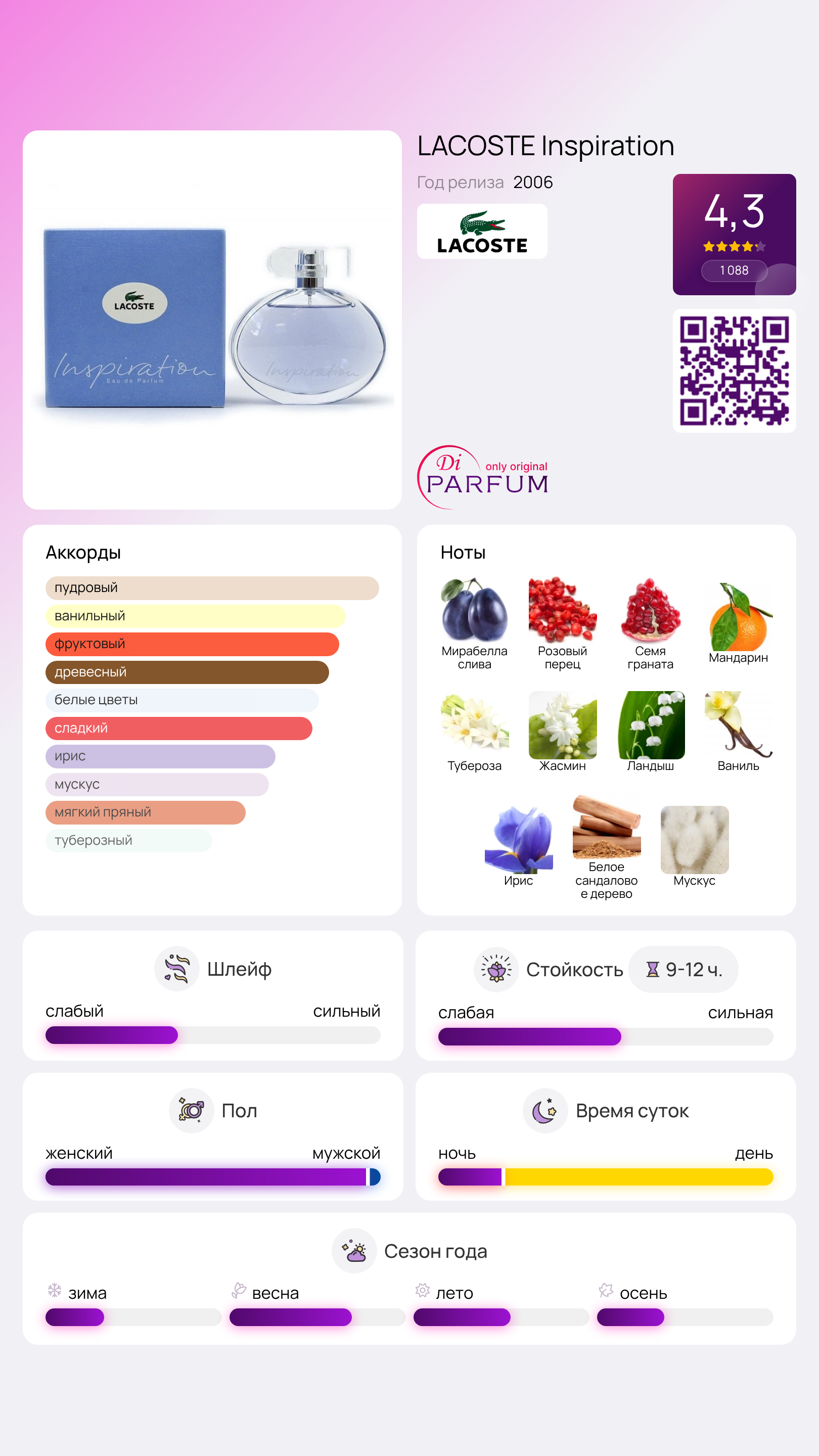 Парфюм Inspiration от Lacoste – это не просто аромат для гурманов, но и возможность почувствовать себя особенной, как настоящей королевой. Этот дух олицетворяет собой нечто уникальное, не поддающееся шаблонам, и создателям удалось успешно воплотить свой смелый задум в жизнь.