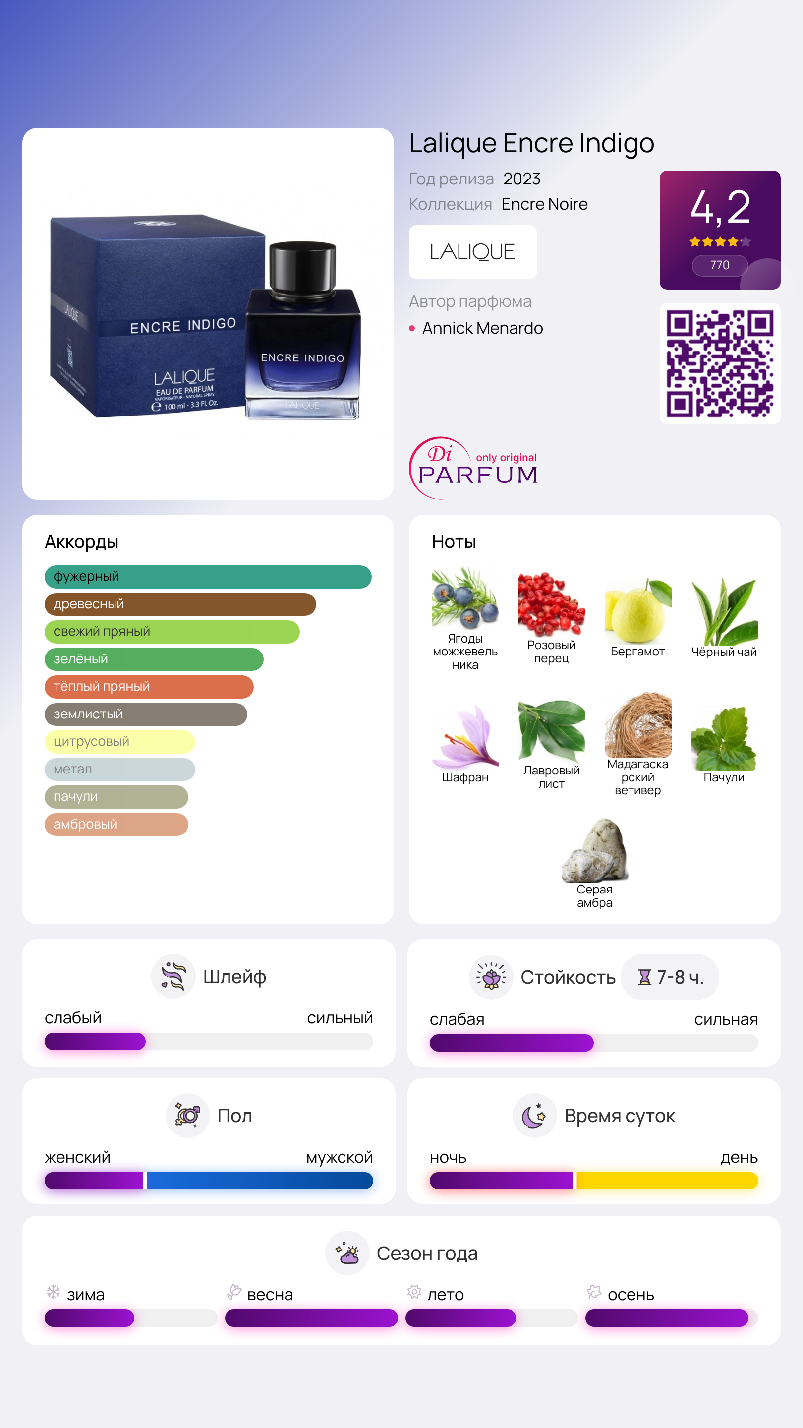Обновленная версия французского аромата Lalique Encre Indigo привлечет внимание каждого современного мужчины. Этот мужской парфюм, выпущенный в 2023 году, уже завоевал множество поклонников благодаря своей чувственной притягательности, брутальности и насыщенным пряным, ароматическим и древесным нотам.