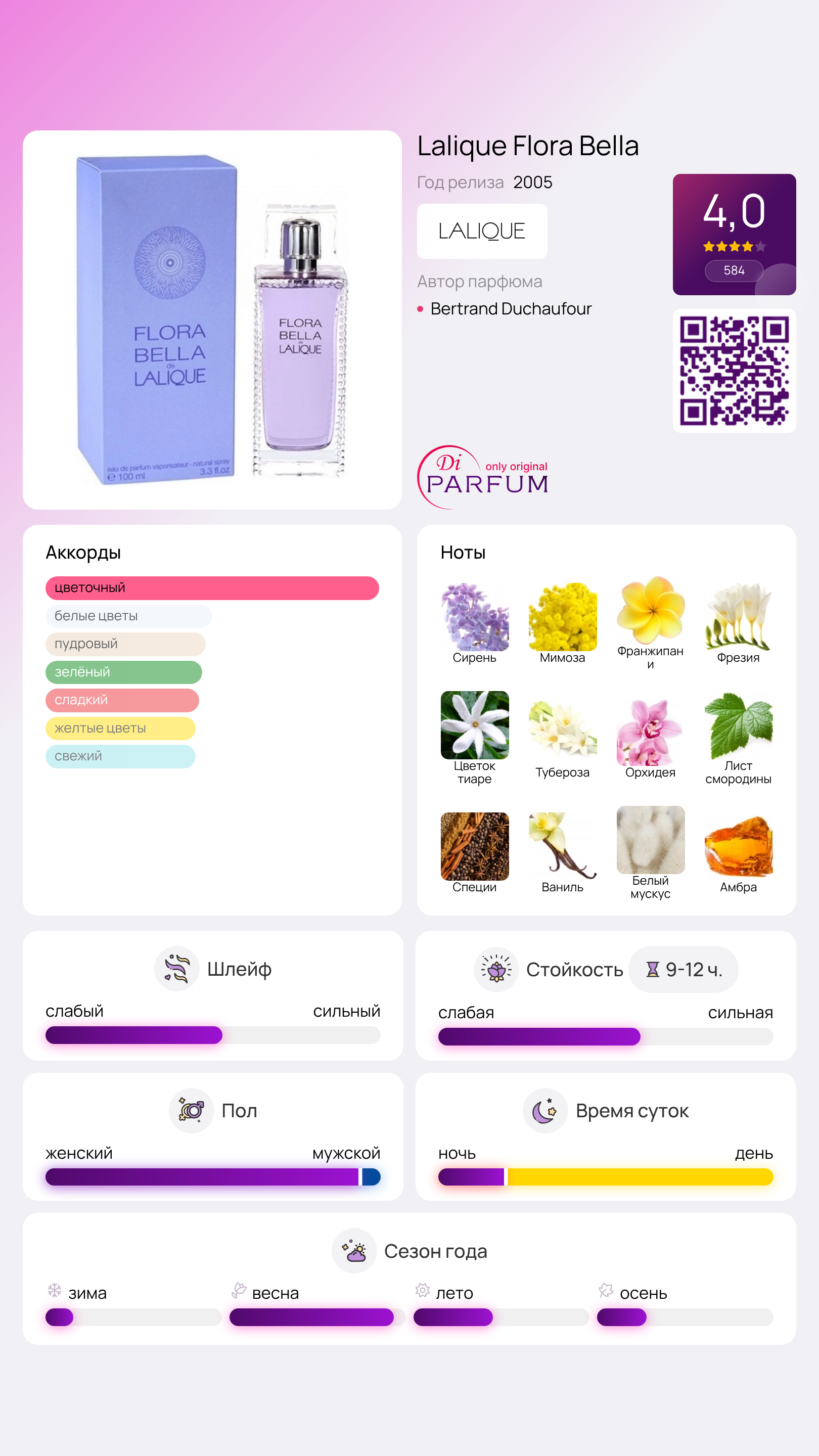 Композиция Flora Bella включает в себя бергамот и мандарин, листья фиалки и лепестки розы, голубую фрезию и дафну, черную смородину и франгипани, туберозу, миндаль, ваниль и белый мускус. Все эти ноты складываются в великолепный букет.