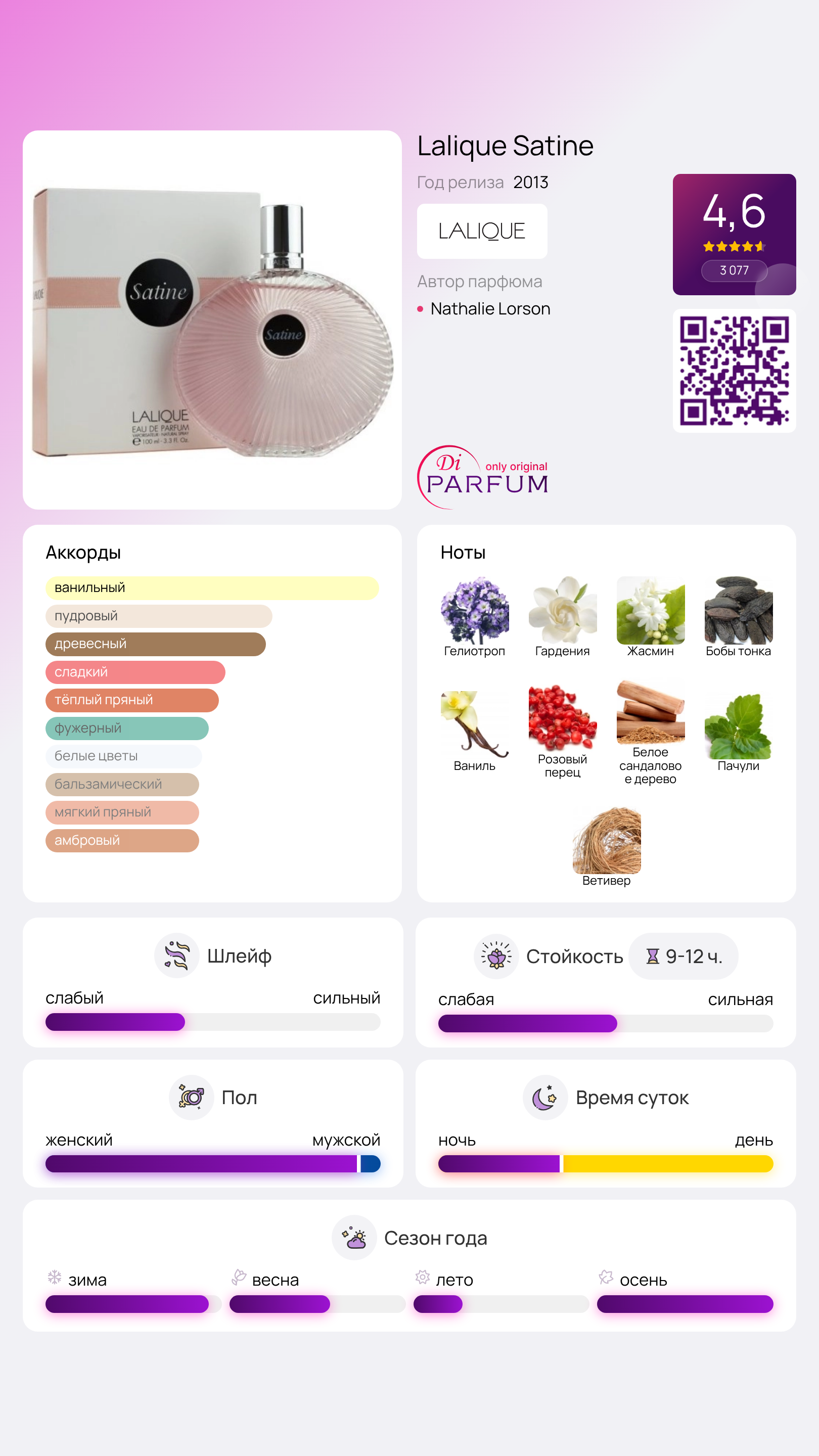 Lalique Satine по праву считается одним из лучших антидепрессантов среди парфюмов бренда, адресованных женщинам. Ваниль и контрастные цветочные ноты формируют атмосферу праздника, что объясняет, почему многие российские женщины выбирают его перед новогодними праздниками, чтобы поддерживать тёплое настроение в холодные зимние вечера и делиться им с окружающими.