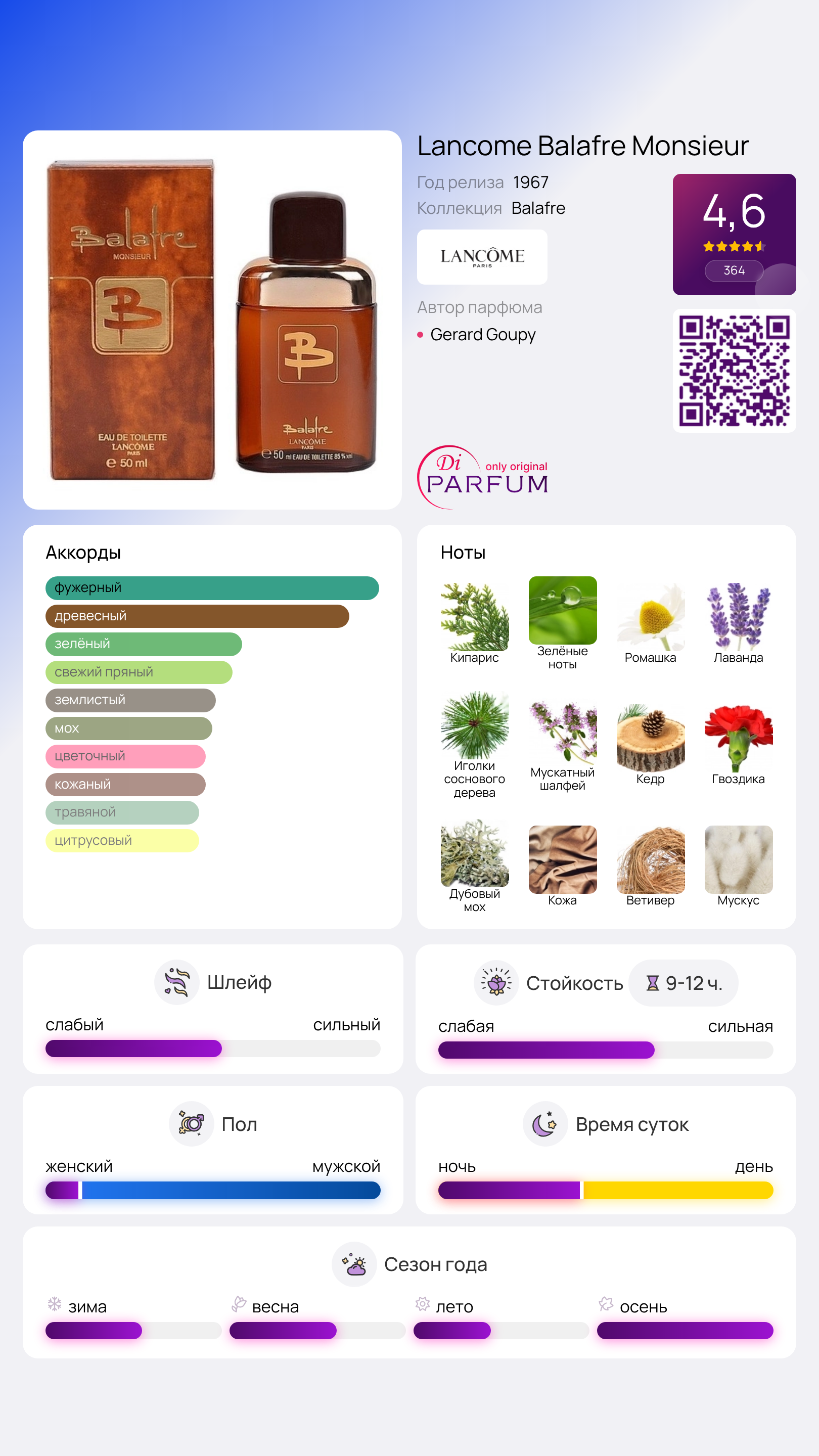 Этот редкий винтажный парфюм сводил с ума женщин и стал настоящим трофеем для мужчин — идеальный шипровый аромат от знаменитого бренда Lancome под названием Balafre Monsieur. Его первое появление на рынке состоялось в 1967 году, и он стал символом мужественности, смешанного с нотами дерзости, брутальности и исключительного французского шика.